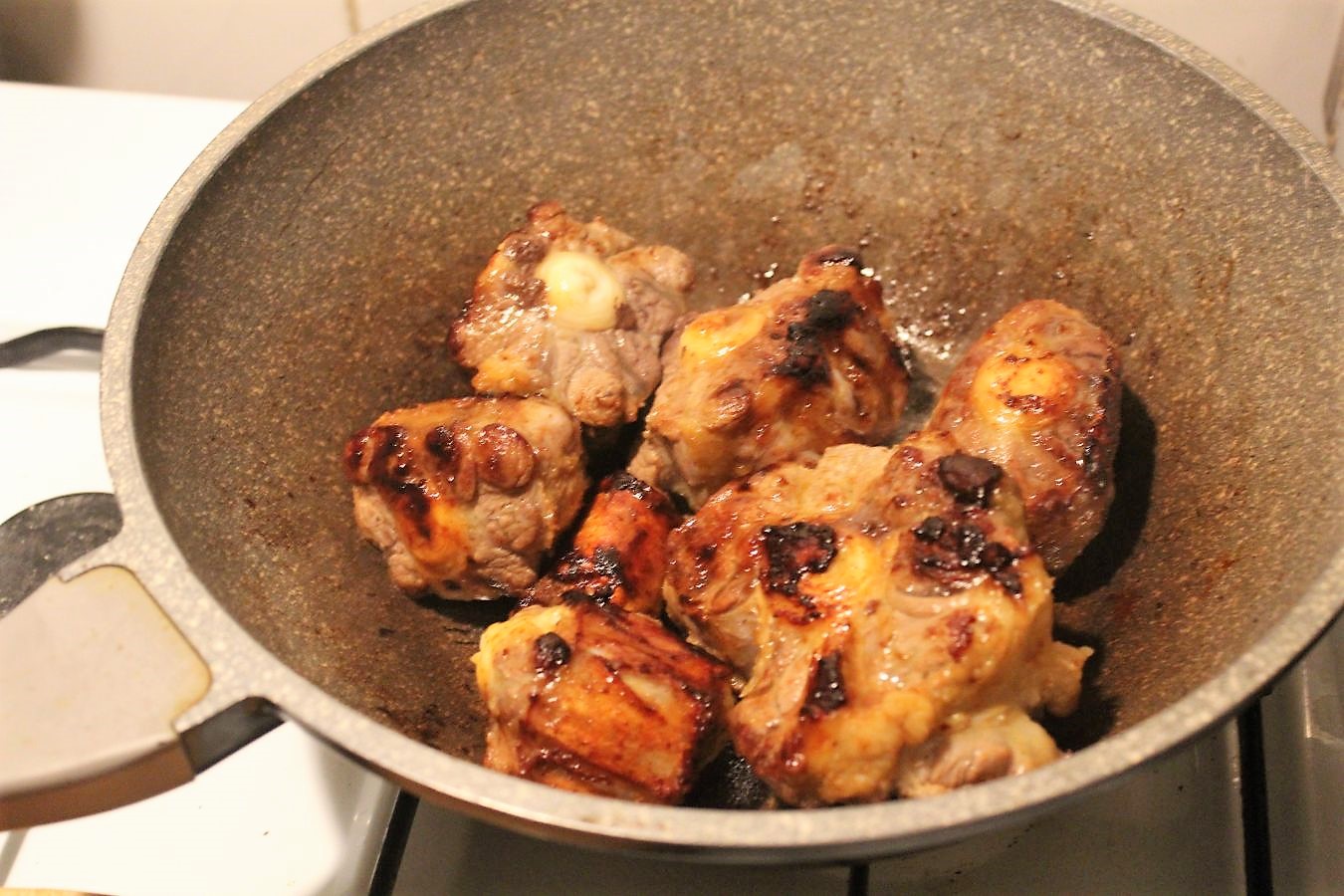 Pfanne volle Pulle anstellen und den Ochsenschwanz in den Wok legen. Deckel auf den Wok legen, damit sich die Geruchsentwicklung und die Fettspritzerei in Grenzen hält. Zum Anbraten rechne ich immer um die 20 Minuten, also gut alle 3 Minuten die Lage ändern