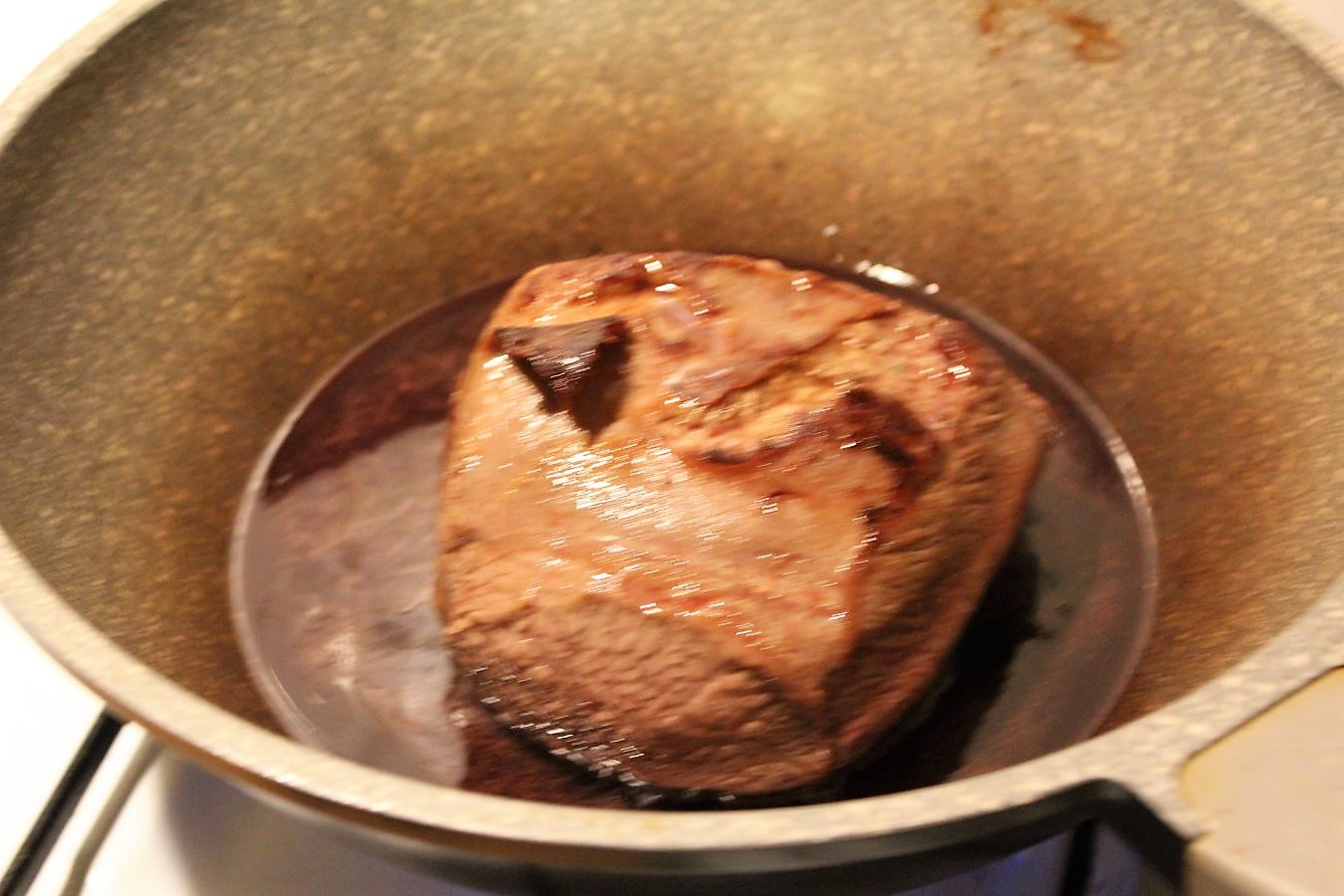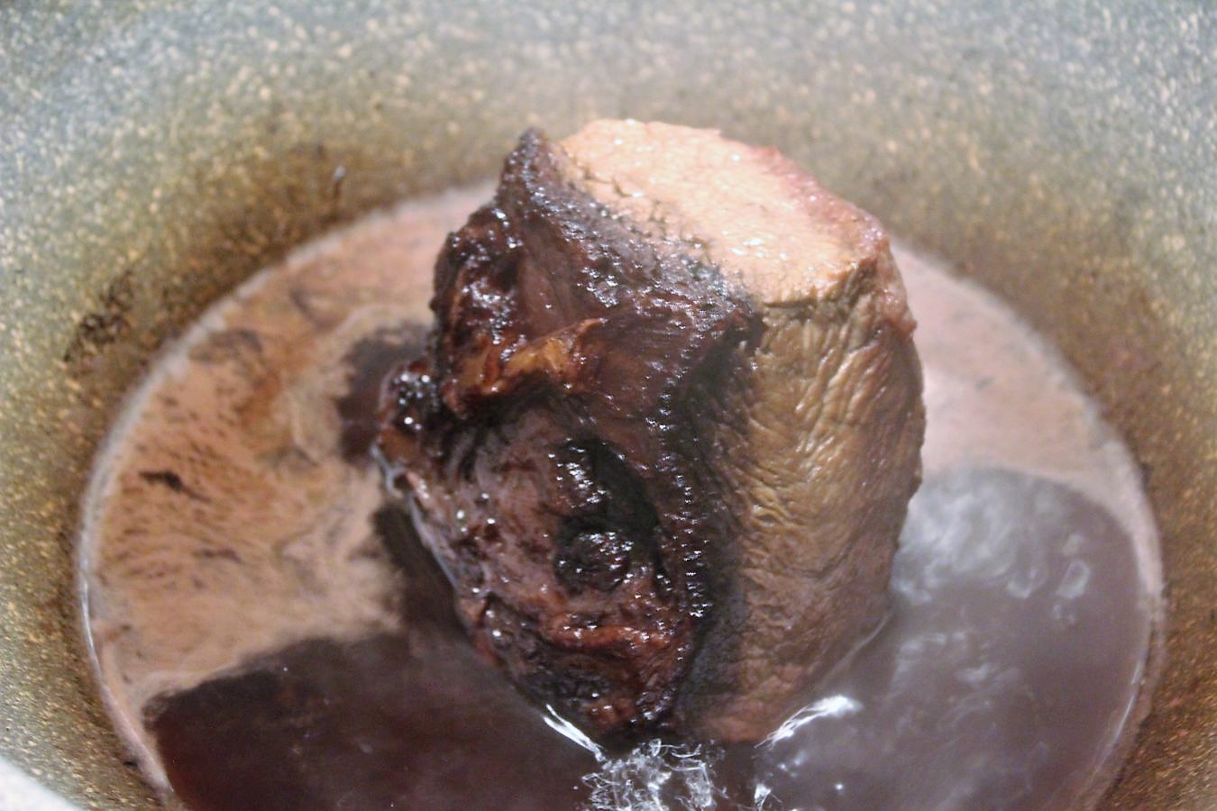 Herd ausstellen, Deckel wieder auf den Wok legen, damit das Fleisch bis zum nächsten Tag nicht austrocknet und den Wok in den kalten Ofen, oder irgendwo abstellen, wo es recht kühl ist. Ich weiß jetzt schon, ohne probiert zu haben, dass das ein tolles Stück Fleisch wird und dass es wie verrückt schmecken wird, weil ALLES schmeckt, was drei Stunden auf dem Herd stand und wenn das mit wenig Temperatur war, dann kann es auch nur zart sein.