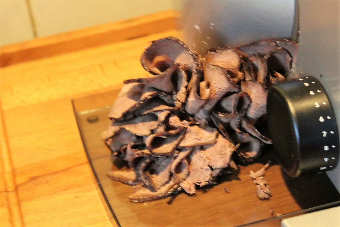 Das Fleisch soll möglichst dünn geschnitten werden. Ich nehme dafür meinen Allesschneider und stelle den auf 3 Millimeter Dicke ein.