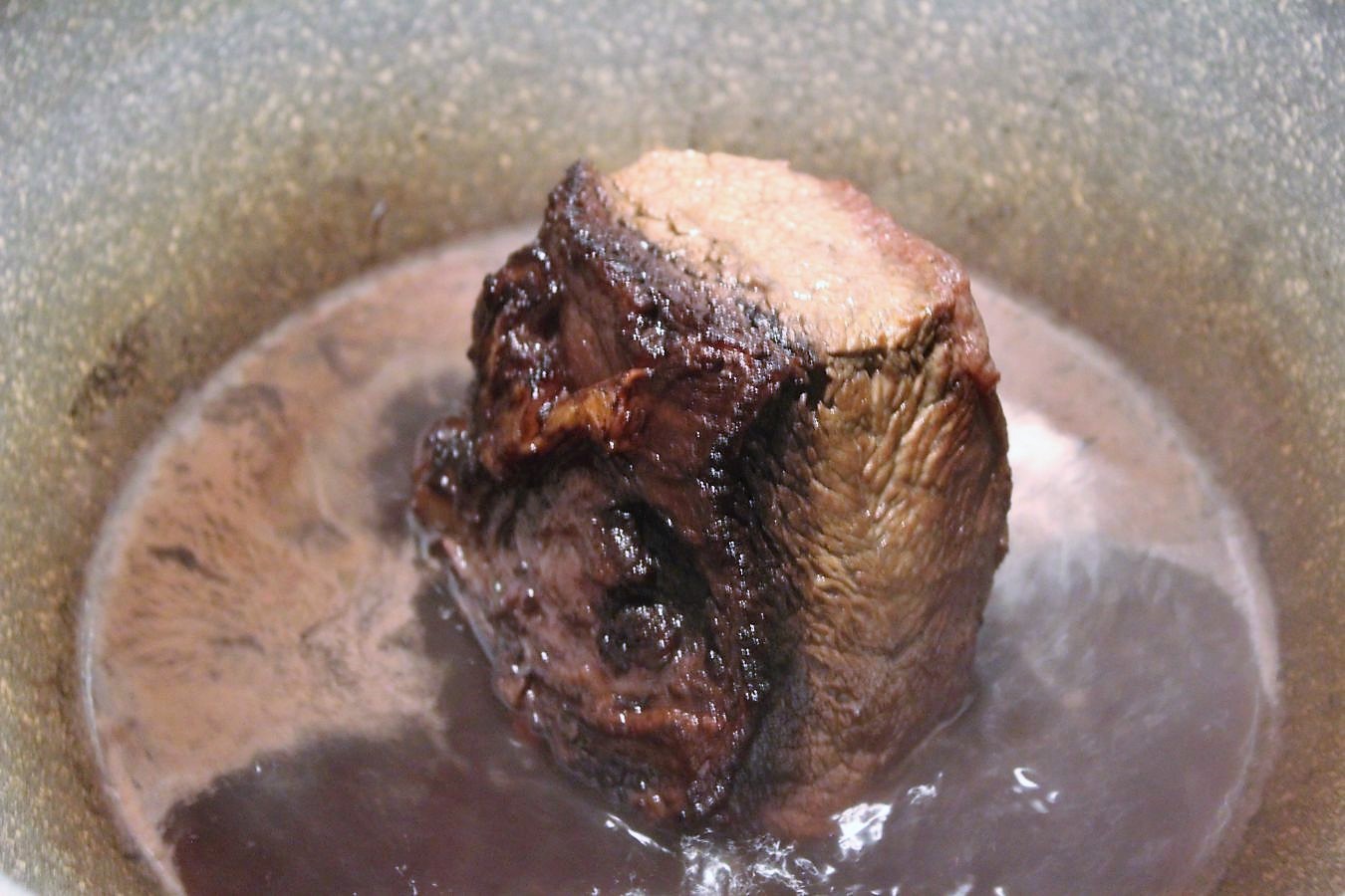 In der letzten Stunde drehe ich es alle 10 Minuten um, damit alle 6 Seiten mal im Wein liegen dürfen und eine geile dunkle Farbe bekommen. Wer das Fleisch dann heiß essen will, kann das tun, braucht aber ein scharfes Messer, ohne Säge, damit das Fleisch nicht auseinander fasert, wenn man es gleich heiß schneidet. Meine Pläne sind für kaltes Fleisch, deswegen bekommt der Schmorbraten jetzt noch ein wenig Pause.