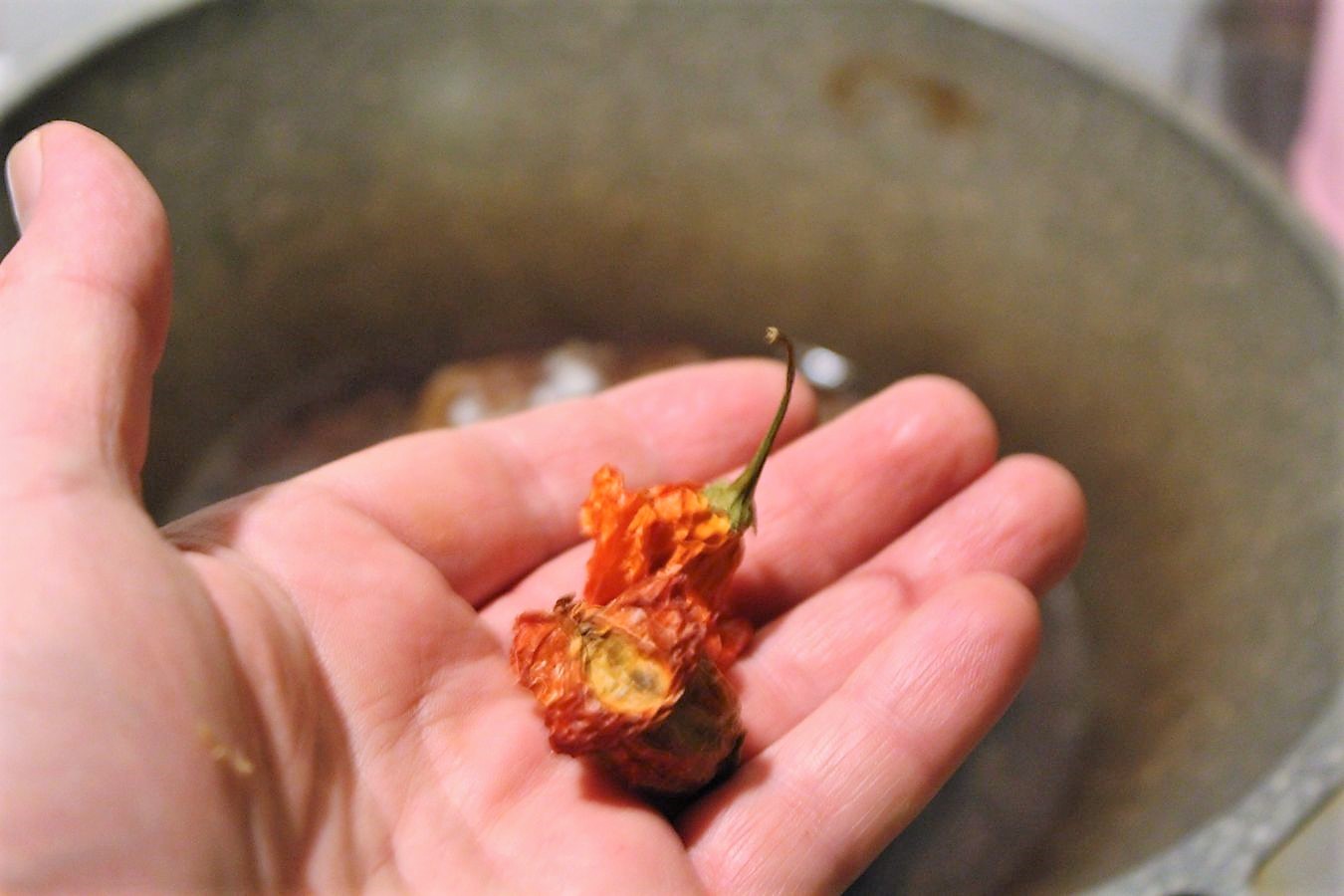 Wo Salz ist, sollte auch Pfeffer sein. Ich ersetze Pfeffer durch zwei kleine Peperoni (selbst an der Luft getrocknet). Wer das nicht hat, lässt eben mal kurz die Pfeffermühle rotieren.