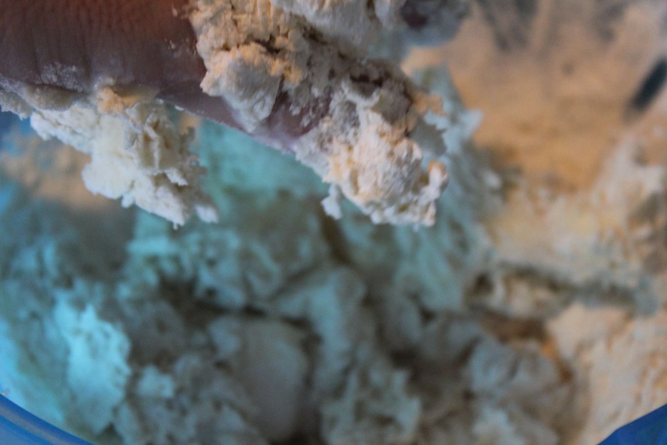 Man kann das mit dem Handrührer verkneten, oder eben auch gut mit den Händen