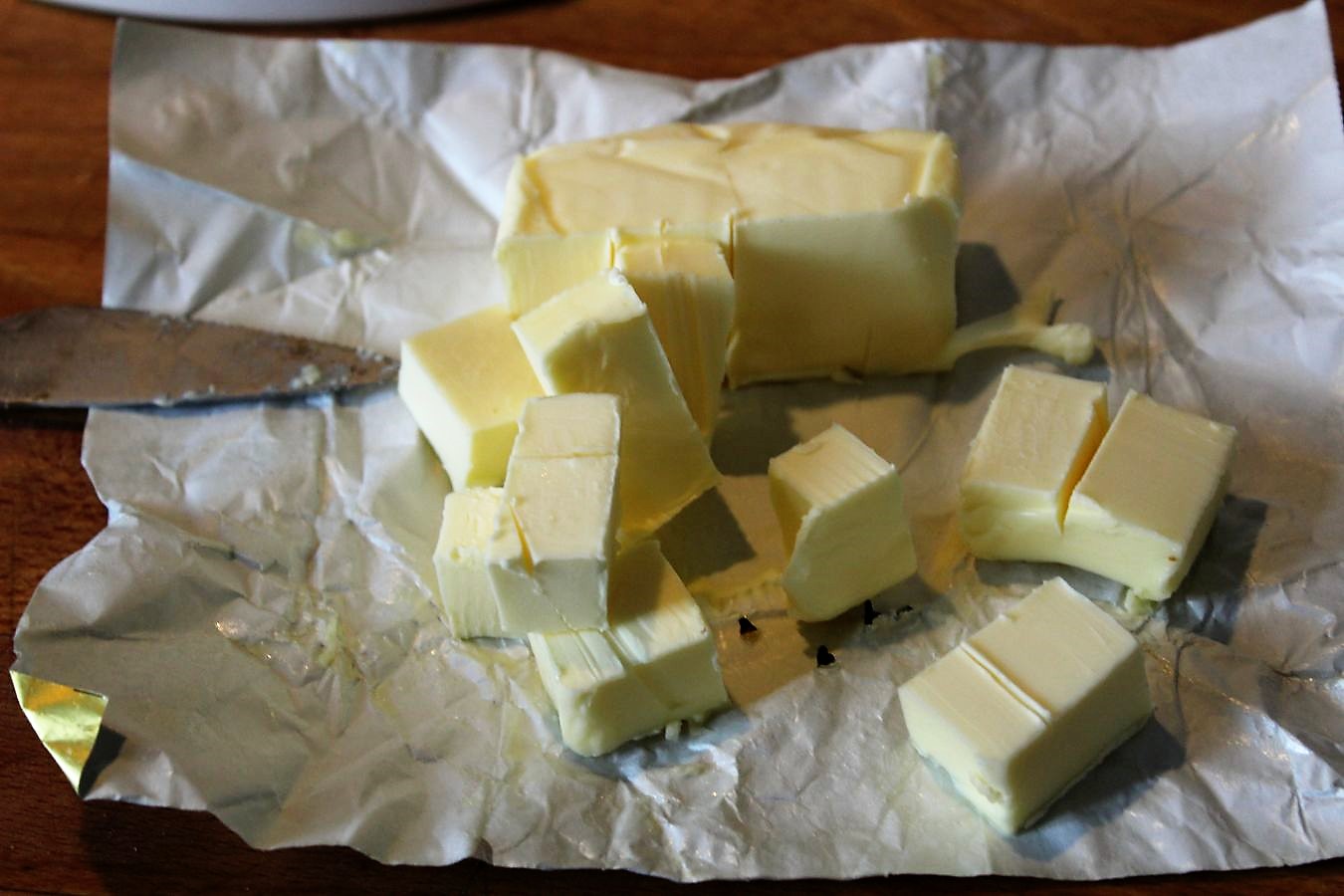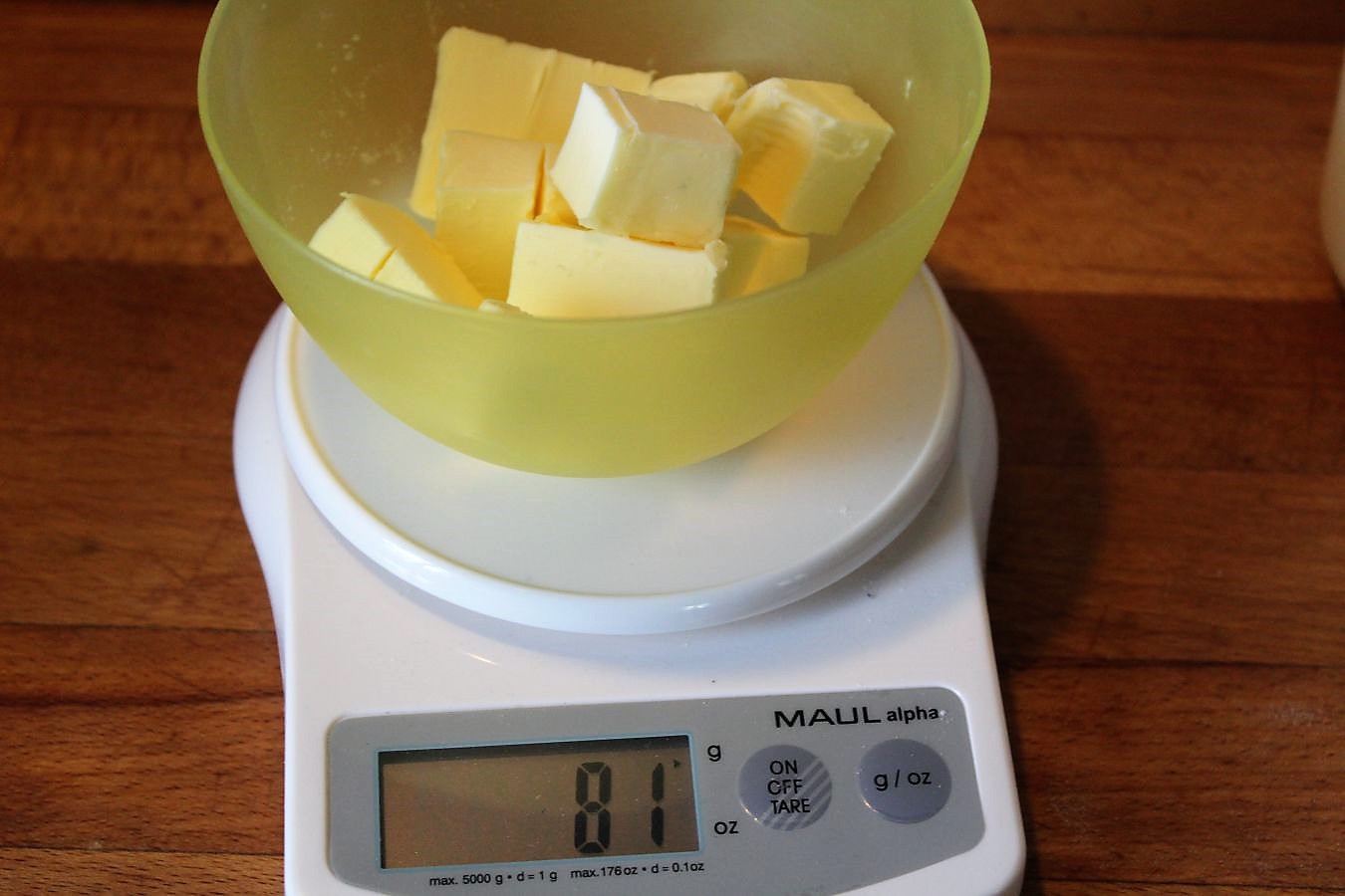 Bei sowas bin ich immer total begeistert, wenn man sich vornimmt, irgendeine bestimmte Menge von irgendwas abzumessen, um es hinterher zu wiegen und wenn dann sowas passiert, wie siehe unten… Die 80 Gramm  kalte Butter in kleine handliche Stücke schneiden. Deswegen ist es an dieser Stelle besser, wenn sie kalt ist.
