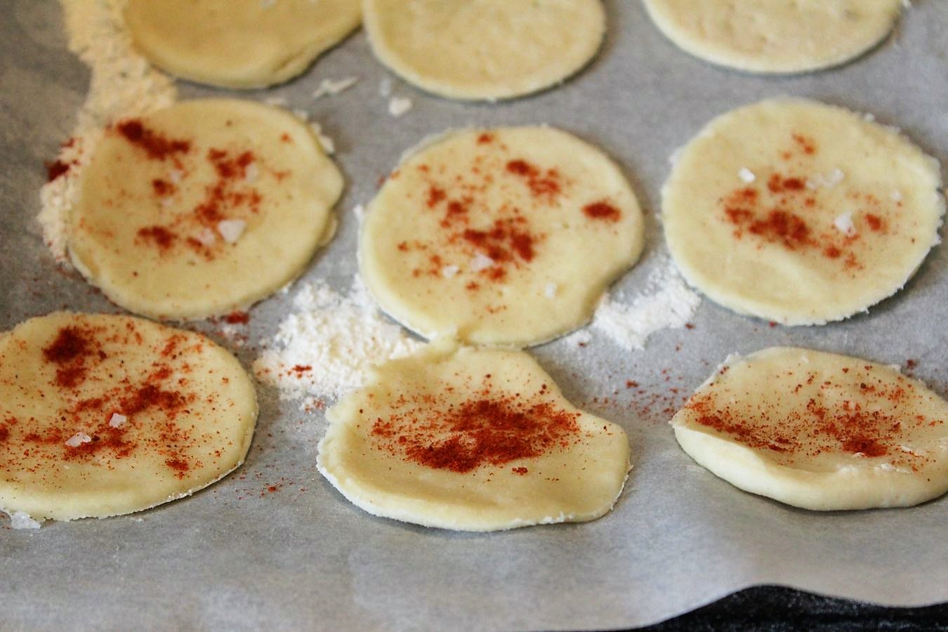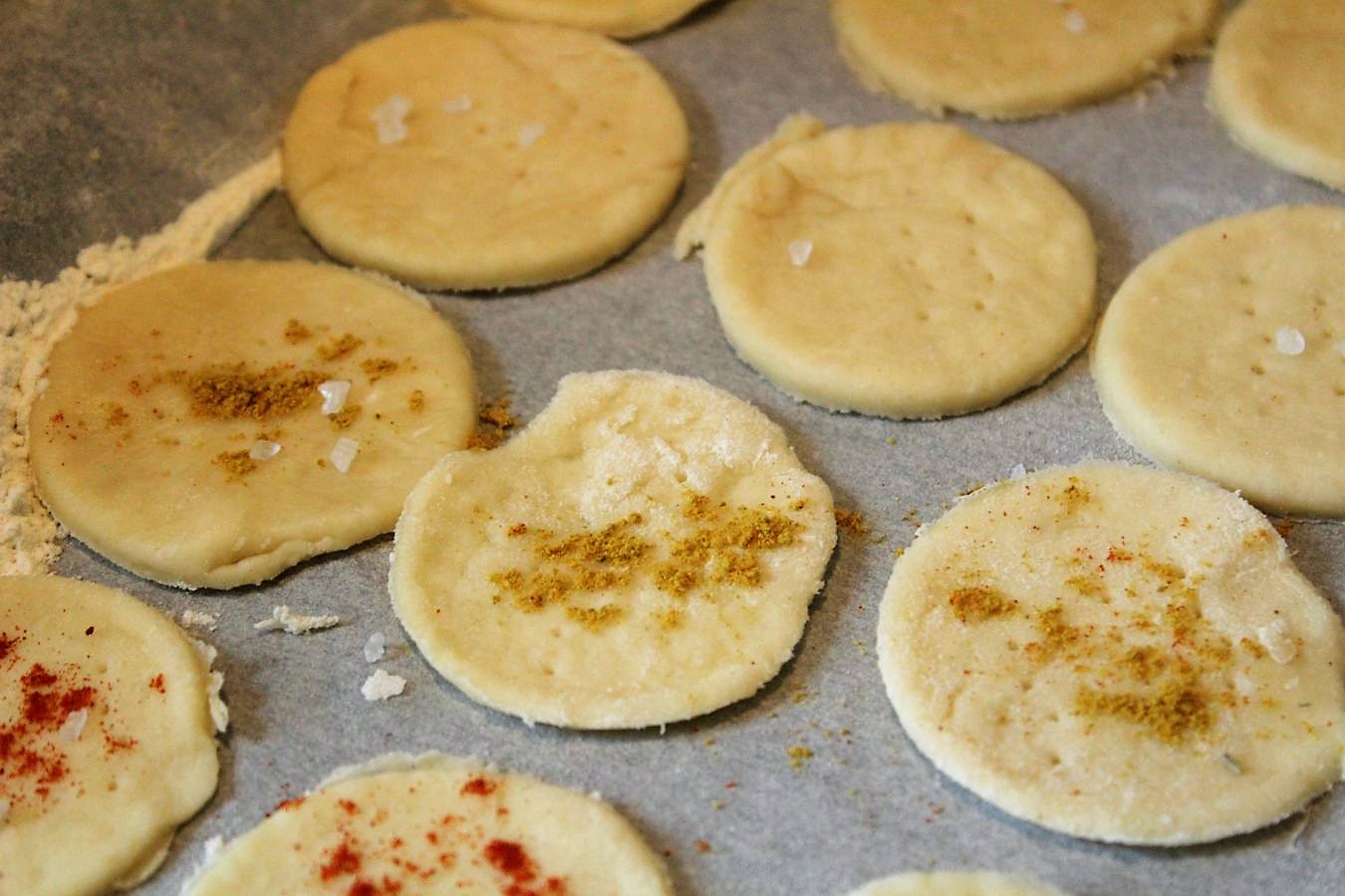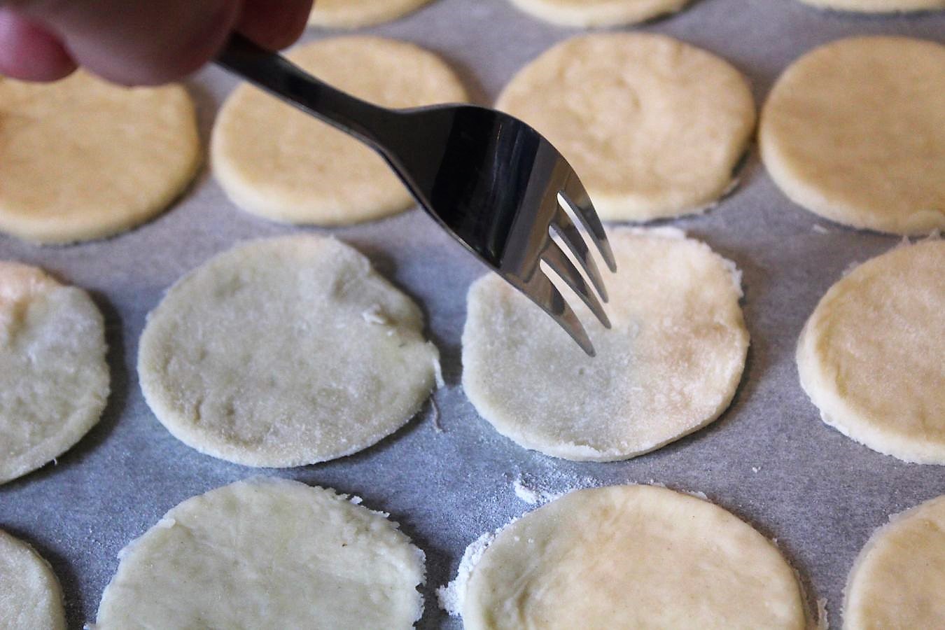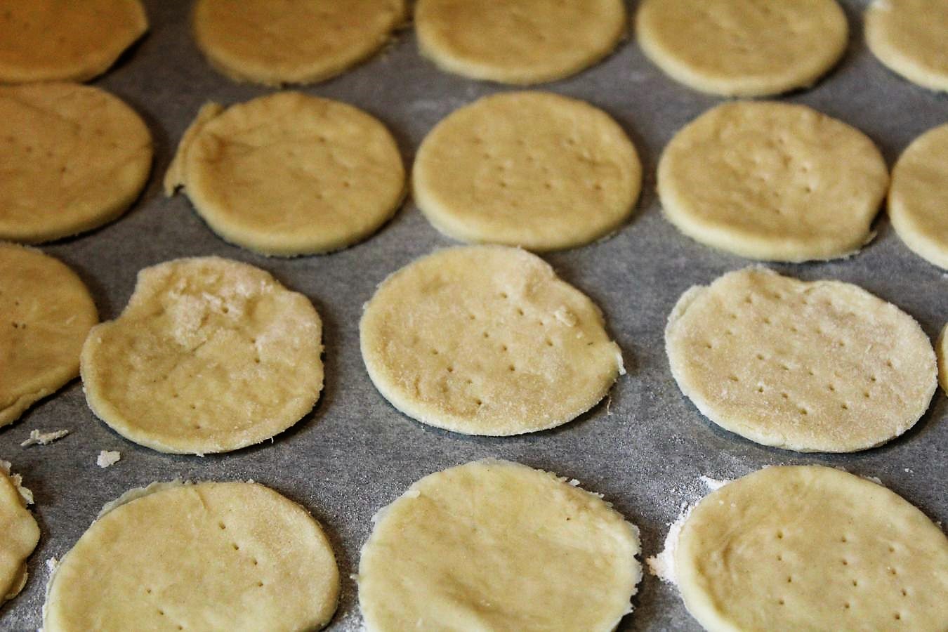 Ich dachte, es wäre neckisch, wenn man mit einer Gabel noch ein paar gefällige Muster in die ausgestochenen Cracker macht. Ich habe keine Erklärung dafür, ob das noch für irgendwas anderes gut ist, aber ich sehe so oft Leute ihren Teig vor dem Backen anstechen, da habe ich mir gedacht, das kann auf keinen Fall falsch sein.