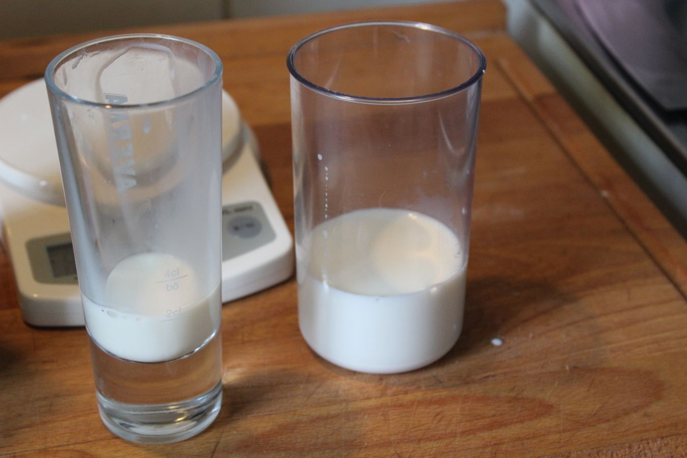 Die 140 Milliliter Milch stehen auf keinem Maß, die ergaunere ich mir dann mit einem Schnapsglas mit Eichstrichen bei 20 und 40 Millilitern
