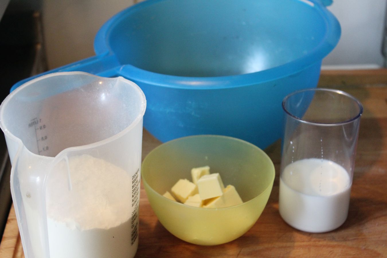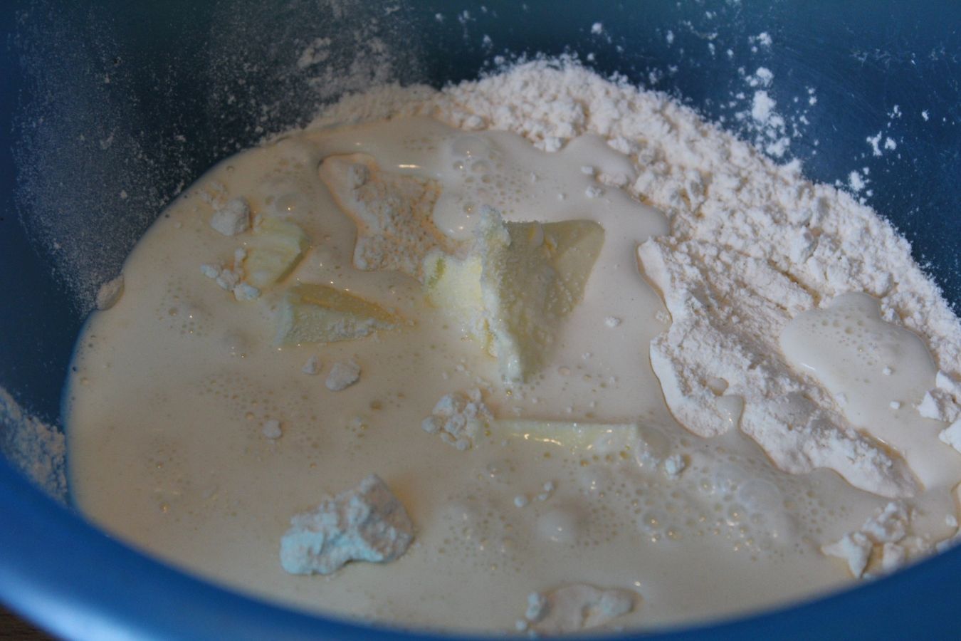 Mehl, Butter, Milch und einen Teelöffel Salz in eine Rührschüssel geben.