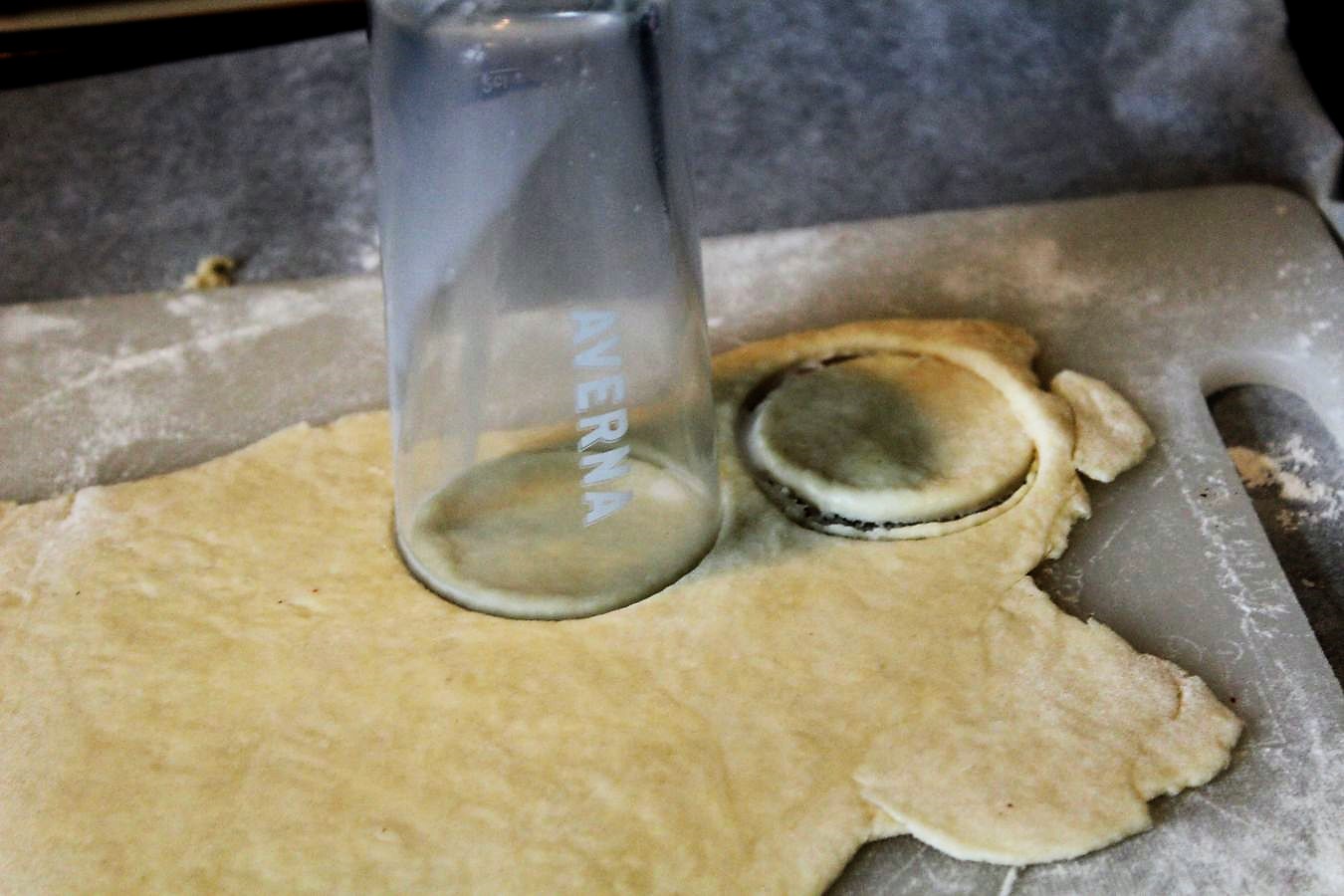 Zum Ausstechen der Cracker benutze ich das Schnapsglas, mit dem ich die Milch abgemessen habe. Man kann natürlich auch Ausstecher, ein Teigrad, oder alles andere verwenden, was die routinierte Bäckersfrau im Haushalt benutzt. Bei mir regiert ja immer die Improvisation, zum Zeichen dass man auch mit nichts irgendwas machen kann. Wenn Ihr mit dem Ausrollen anfangt, könnt Ihr schon mal den Ofen anstellen. Wenn Ihr einen Elektroofen mit Ober- und Unterhitze habt, dann solltet Ihr 220 Grad nehmen. Ich habe einen Gasofen, der nur Unterhitze hat und stelle den zwischen Stufe 5 und 6 ein.