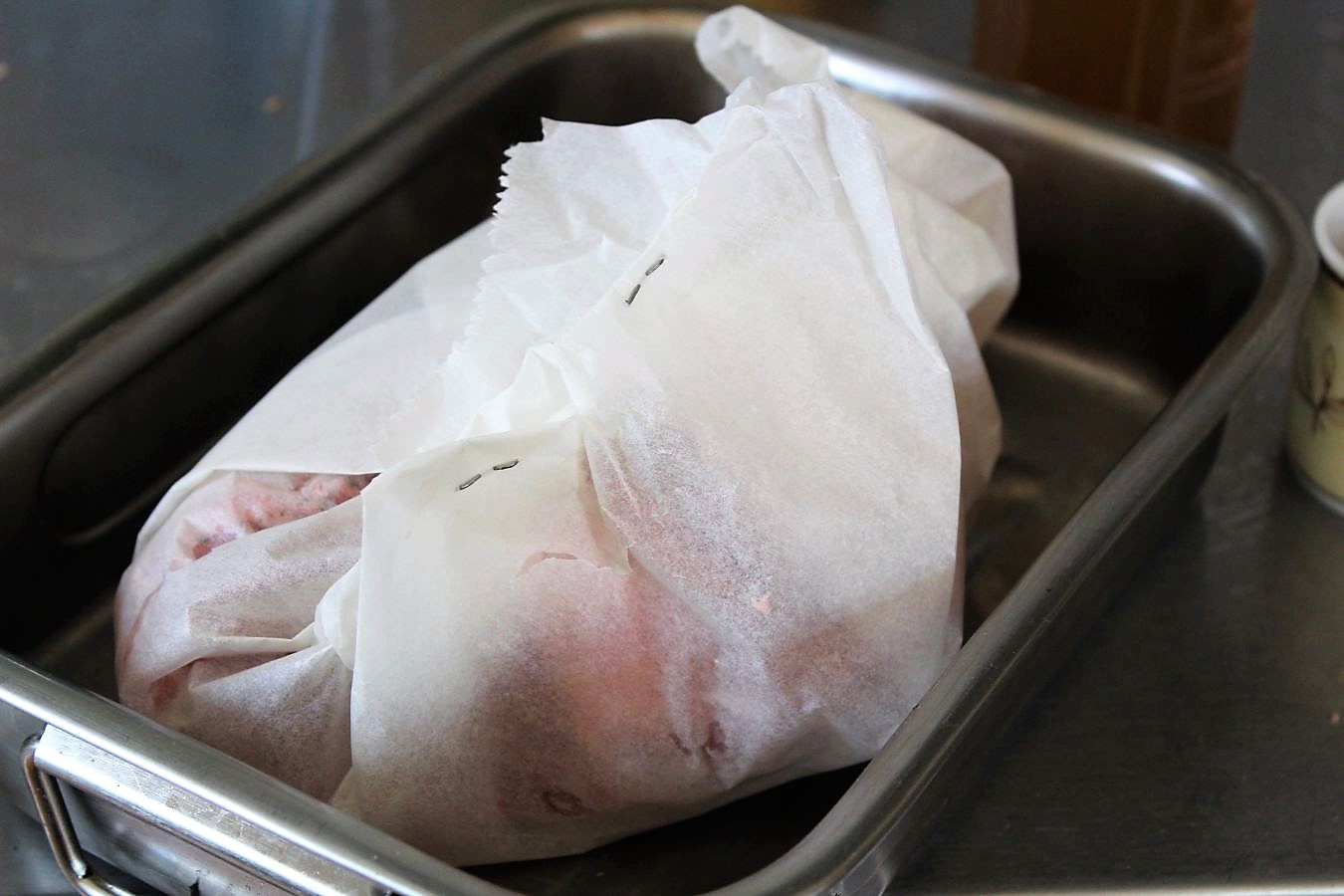 Das Papier möglichst luftig um das Eisbein wickeln und dicht mit Büroklammern verschließen