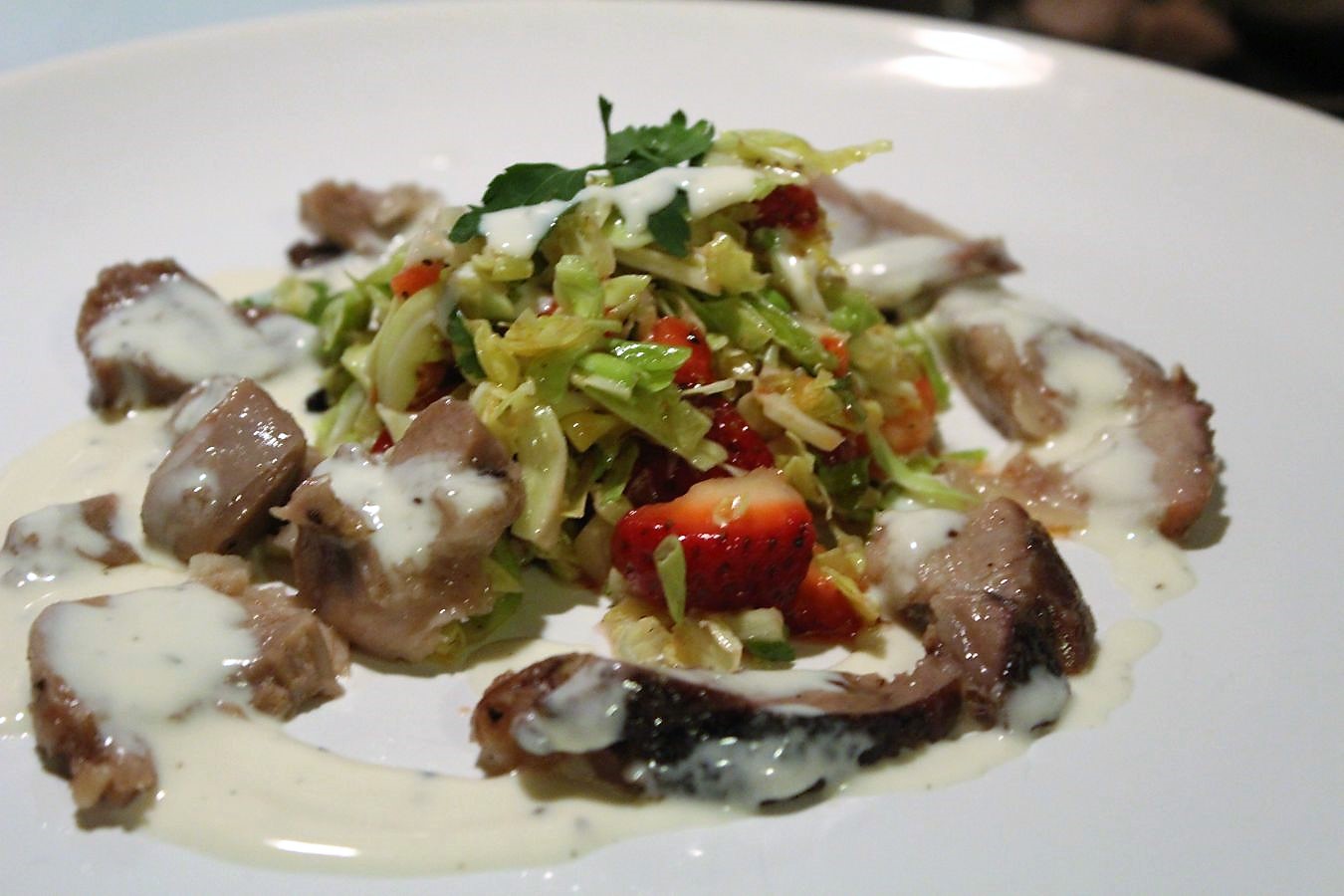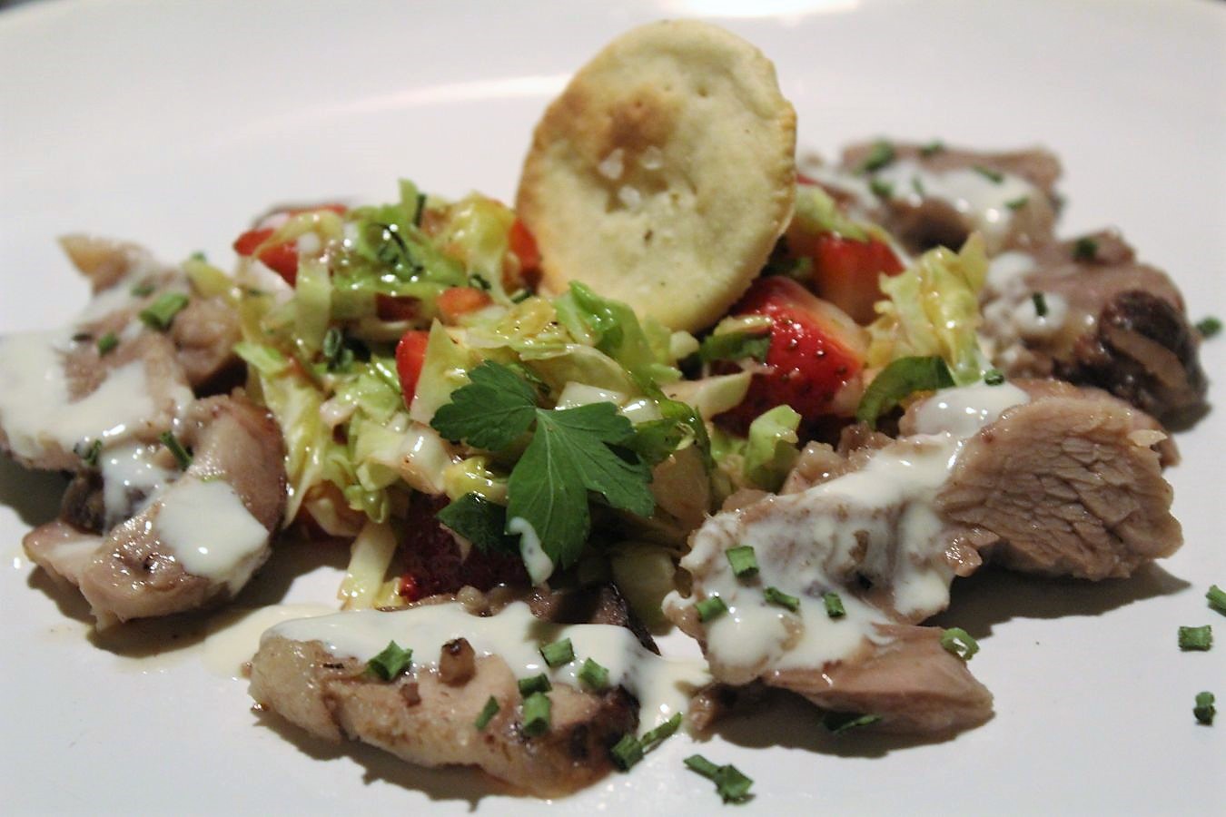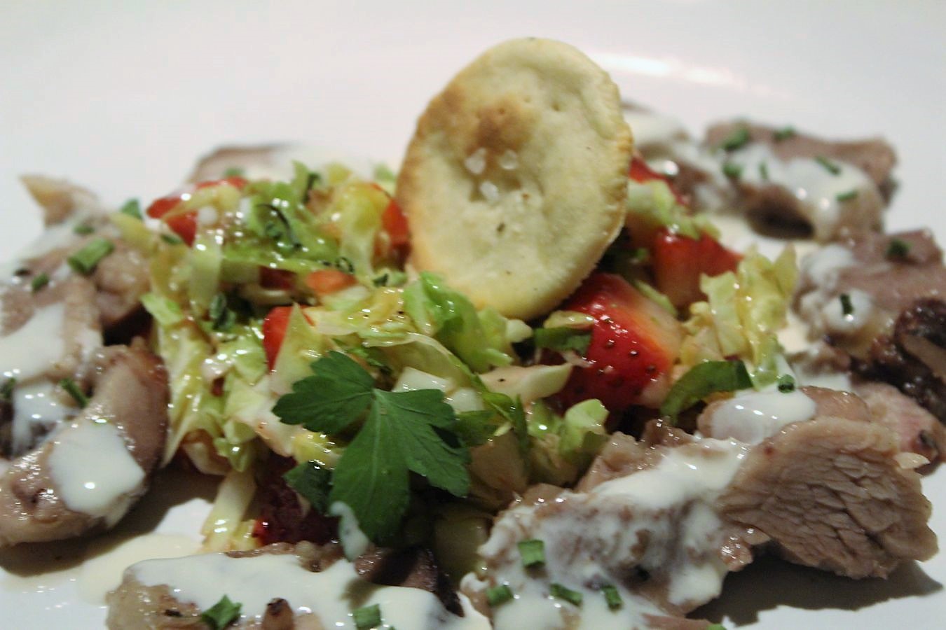 Holla die Waldfee, das ist mal ein Salat. Knackiger Spitzkohlsalat mit Erdbeeren, zartes Eisbein, Joghurtdressing und die knackigen Cracker. Ist das rustikal?