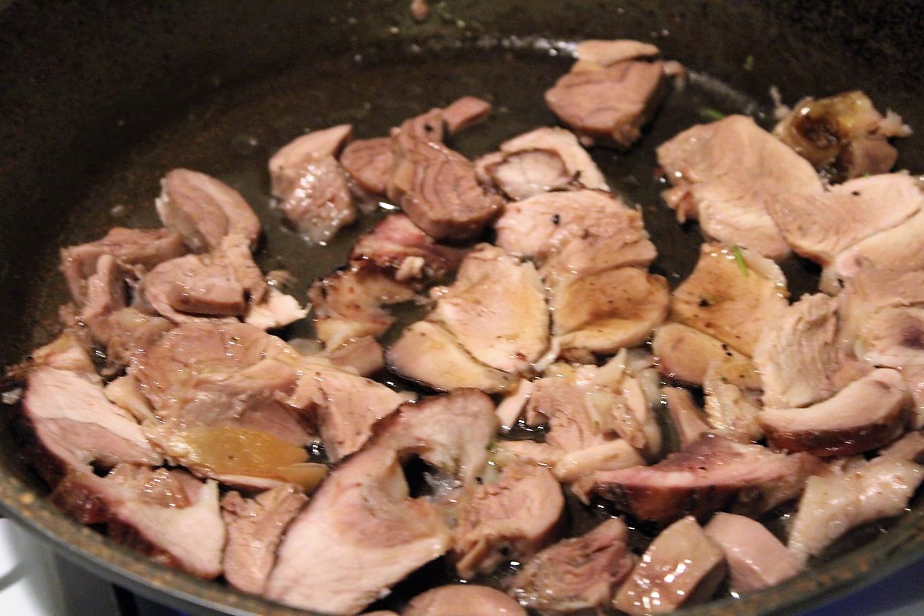 Wenn man das Fleisch nicht kalt servieren möchte (geht auch), oder gleich frisch aus dem Ofen zerkleinert, kann man es in der Pfanne wieder auf Temperatur bringen. Ihr solltet 70 Grad anpeilen, damit es richtig zart ist. das Eisbeinfleisch ist sehr saftig und kurzfaserig und dankt für sorgfaltige Arbeit.