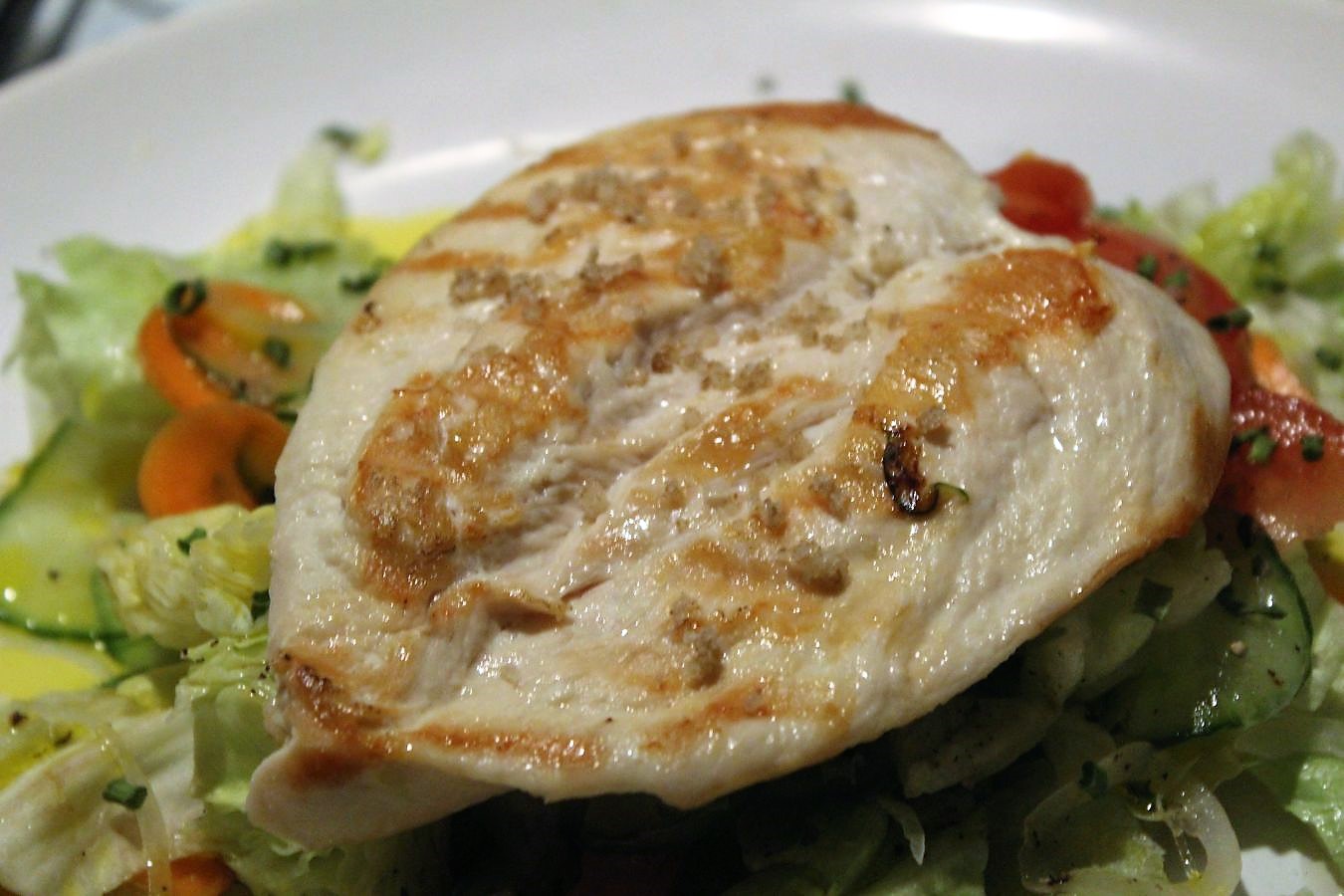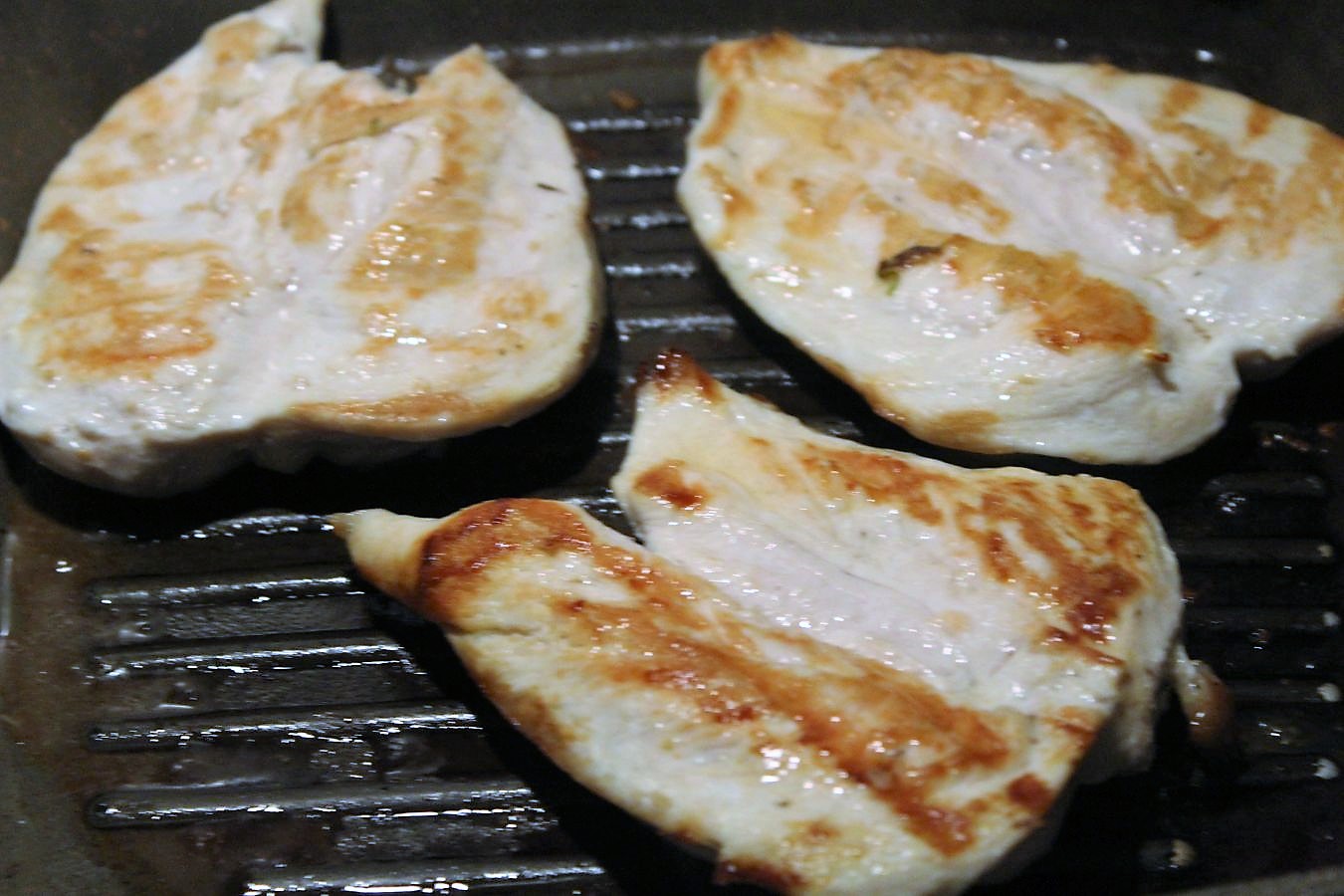 Wenn die Pfanne richtig heiß ist, die Hähnchenbrust 4 Minuten pro Seite in der Grillpfanne braten. Noch nicht würzen, dann würde Wasser aus dem Fleisch austreten und dann wird das Huhn so trocken, wie es keiner haben will.