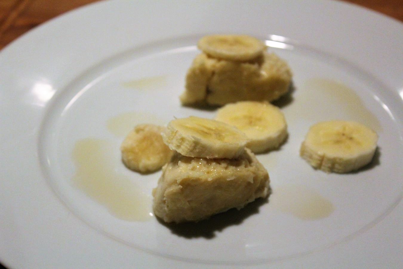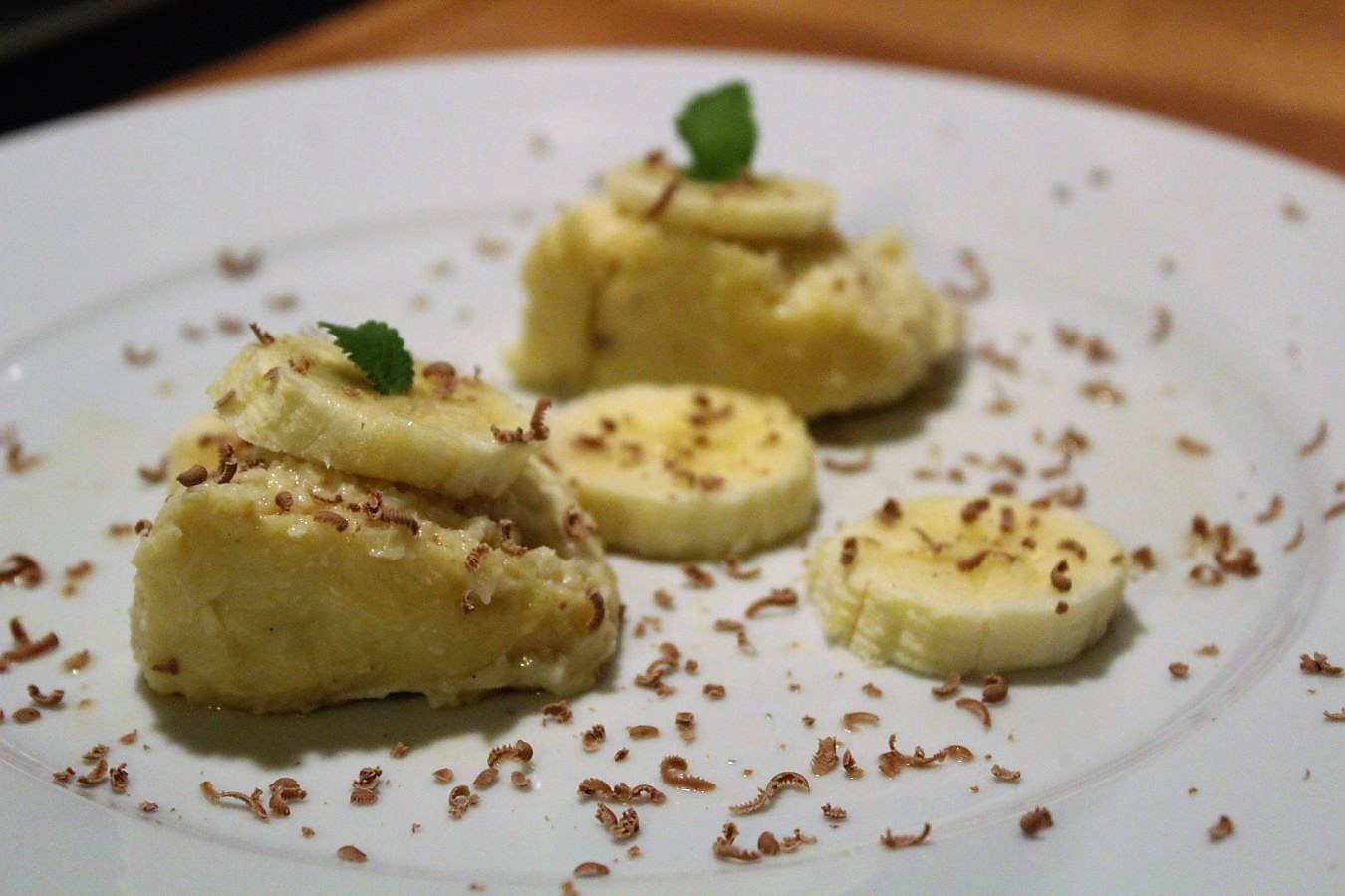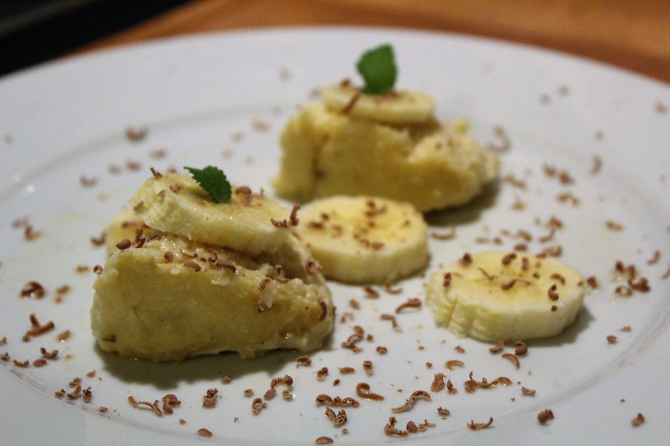 Nocken vom Pudding abstechen, Bananenscheiben dazu auf dem Teller auslegen.