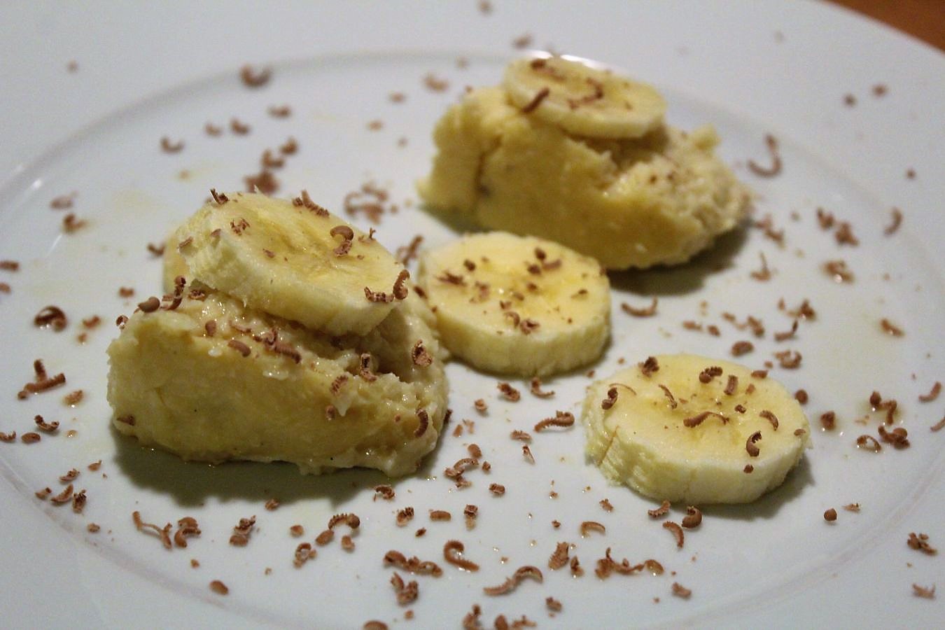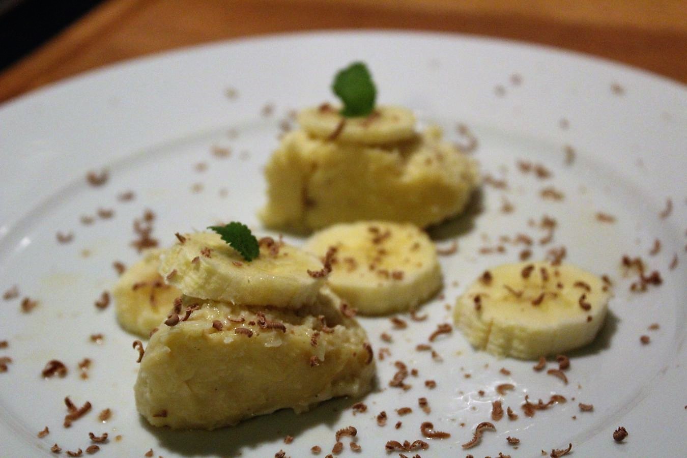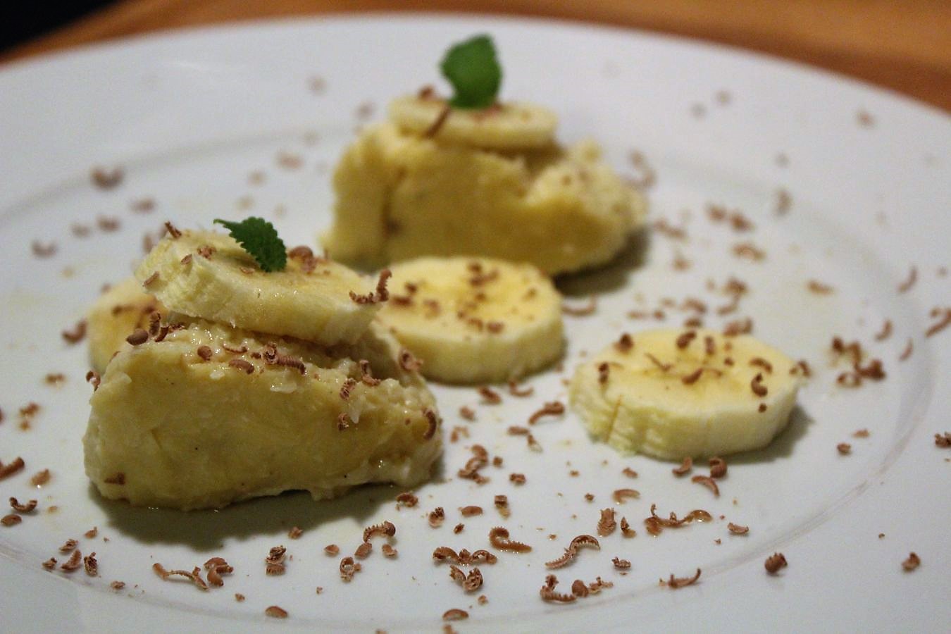 Nocken vom Pudding abstechen, Bananenscheiben dazu auf dem Teller auslegen.