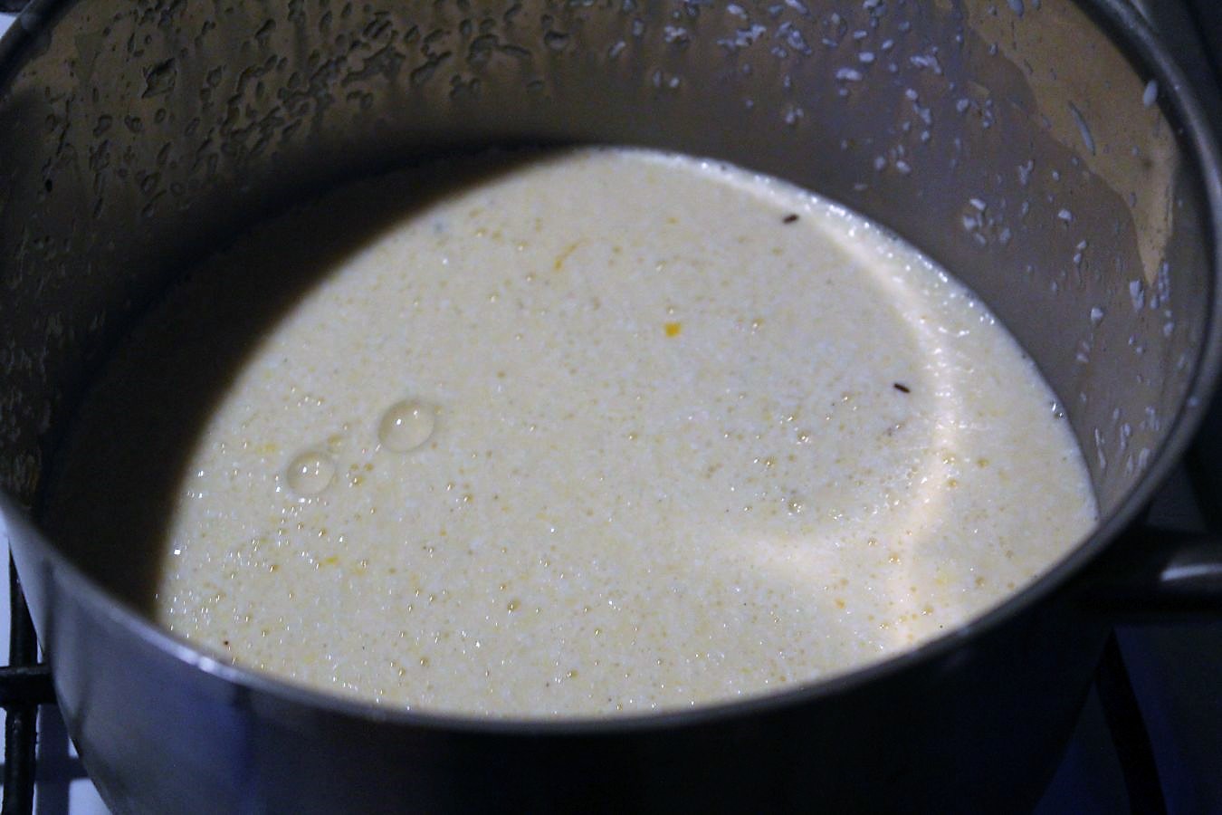 Wenn die Milch kurz aufkocht mit der Hitze auf Minimum runter gehen und unter ständigem Rühren zuschauen, wie die Milch immer mehr andickt.