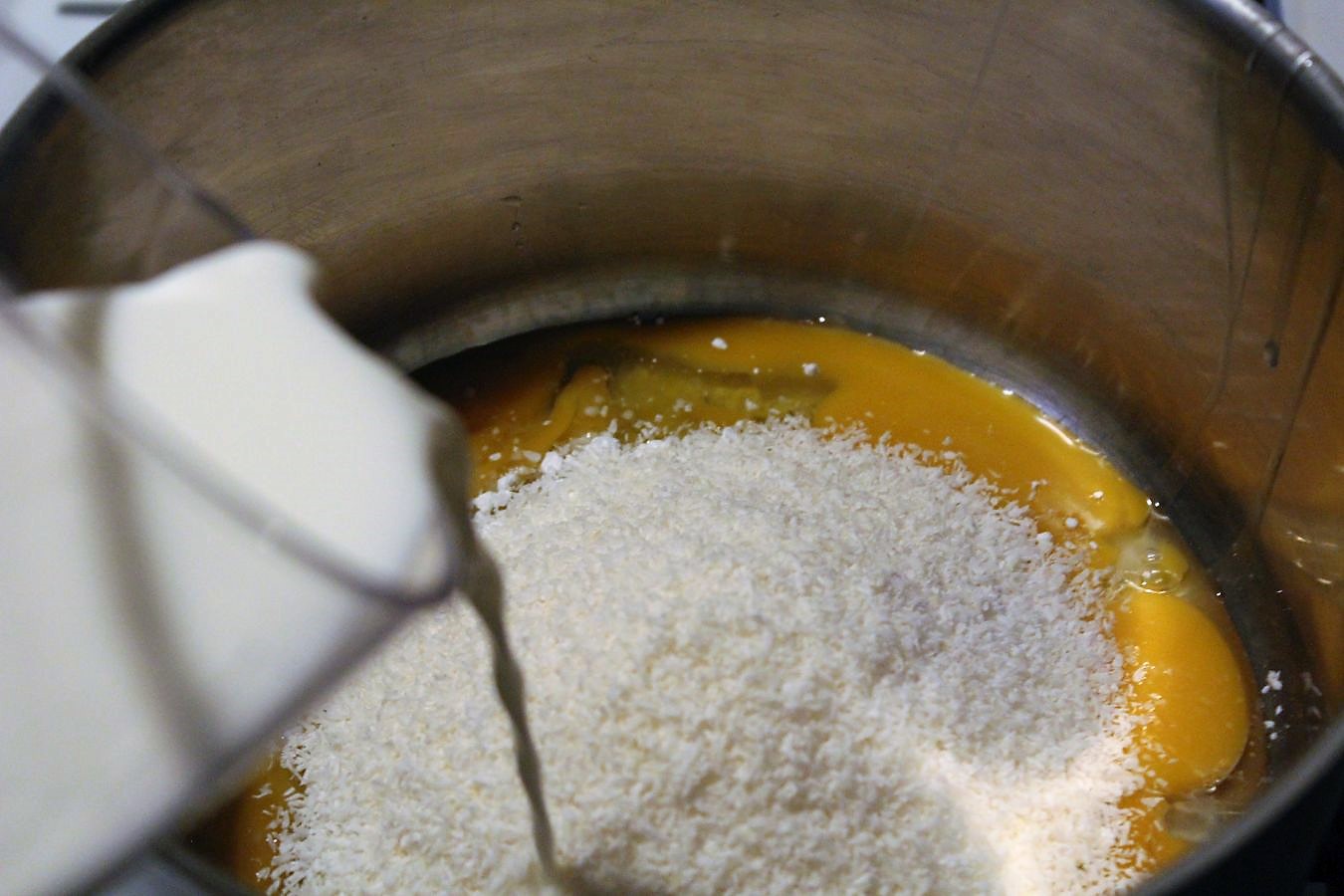 Ich habe noch einen Rest meines Rums mit 73 % gefunden, aber man kann natürlich auch alles andere nehmen, was doof macht. Ich finde Kokos und Rum passen halt gut zusammen.