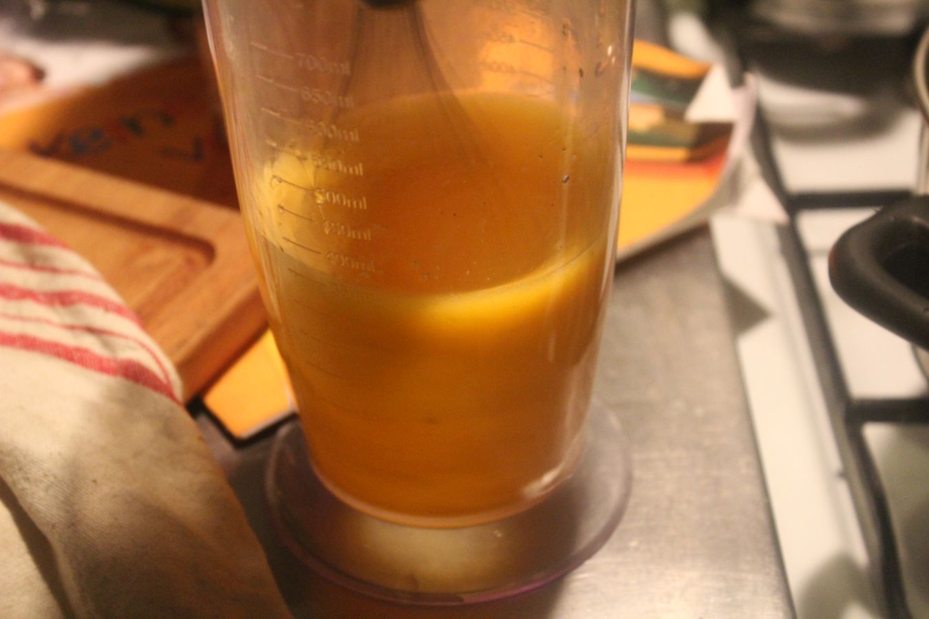 Den Schneebesen schnell laufen lassen und dann nach und nach die heiße Butter aus dem Topf in einem dünnen Strahl in den Mixbecher laufen lassen, aber immer nur in Mengen, die mit dem Eigelb in dem Moment emulgieren können.