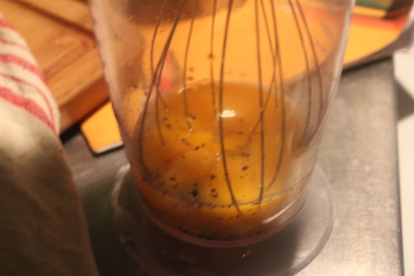 Jetzt geht es los, mit dem Aufschlagen der Soße hollandaise. Im Prinzip müsst Ihr Euch das wie eine warme Mayonnaise vorstellen, die aufgeschlagen wird.