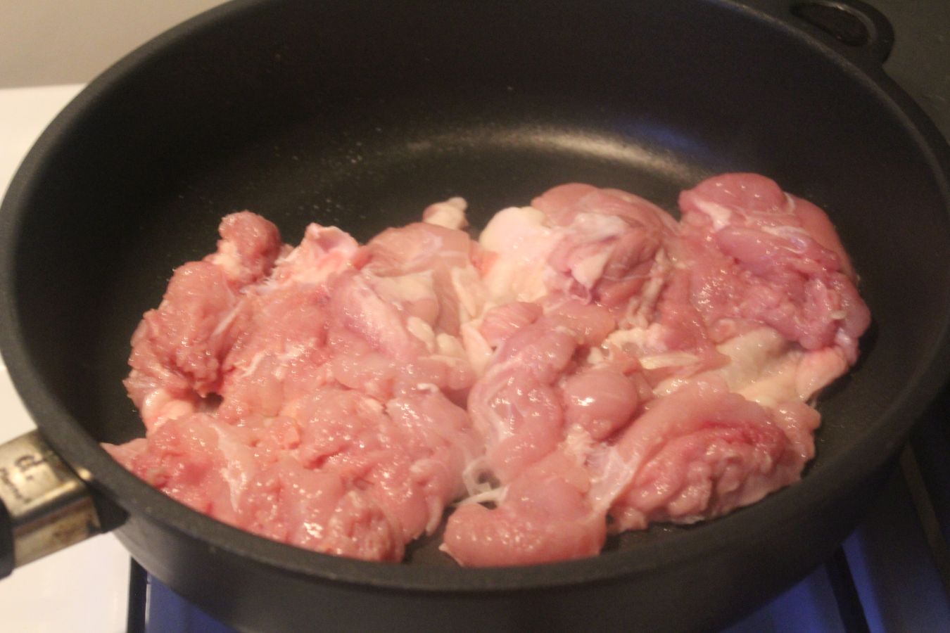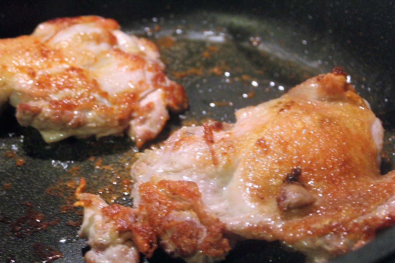 Die Pfanne auf der größten Platte auf höchster Stufe erhitzen. Wenn die Pfanne knallheiß ist, das Hähnchenfleisch auf der Haut in die Pfanne legen. Kein extra Fett verwenden. Es sitzt genug unter der Haut.