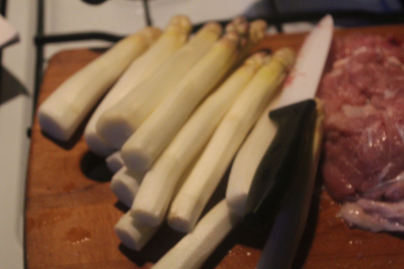 Die holzigen Enden am Spargel abschneiden und dann mit dem Sparschäler die Schalen rundherum abschälen