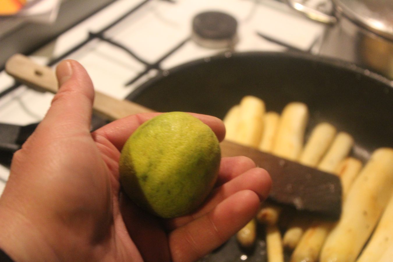 Mit Salz, Pfeffer, Zucker und dem Saft eine halben Limette, oder Zitrone würzen und alle drei Minuten umdrehen. Man kann einen Deckel auf die Pfanne legen, muss man aber nicht machen.
