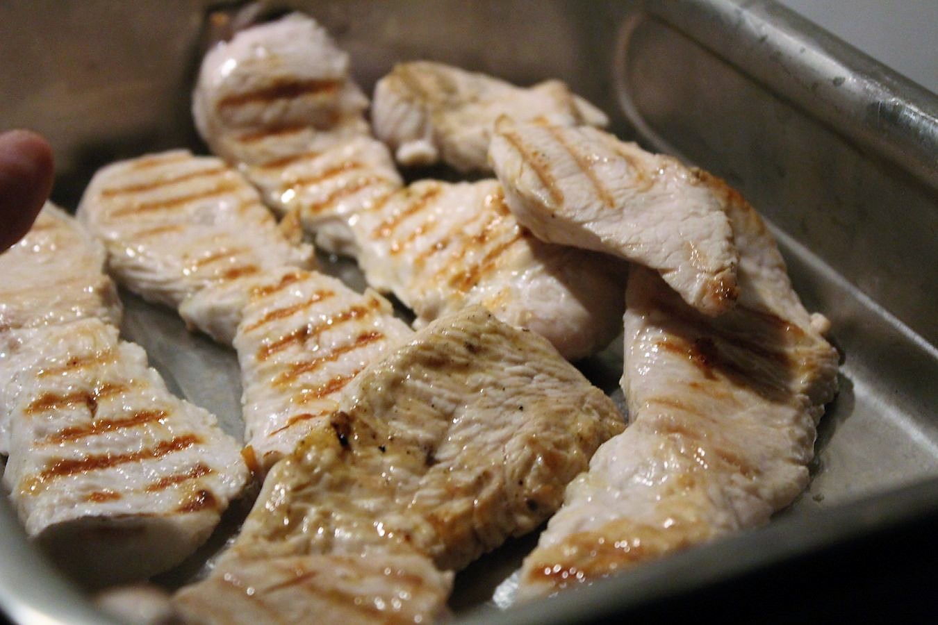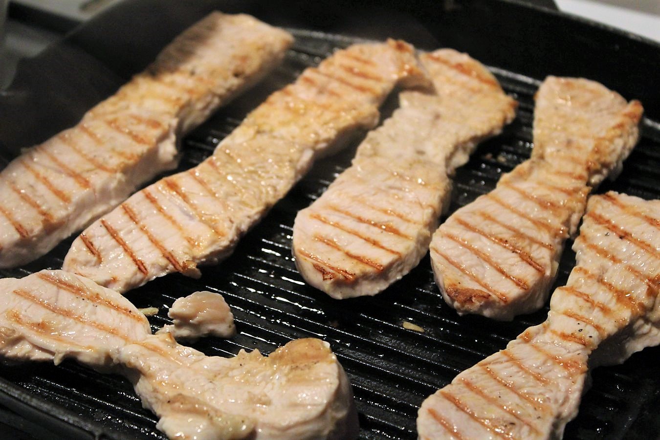 Hier kommt die Grillpfanne ins Spiel, weil ich Putenfleisch verwende, fette ich die Rippen der Pfanne ein bisschen ein. Im Prinzip ist es egal, ob man Putenfleisch, oder Schweinefleisch verwendet. Ich kaufe immer so ein, dass ich irgendwas im Kühlschrank habe, was mir ein paar Optionen lässt. gerne auch am Stück, zum selbst zuschneiden. Dann kann ich in der Woche selbst entscheiden, ob ich etwas kurzgebraten zubereite, oder am Stück als Braten serviere. Dann könnte ich es auch schon einen Abend vorher zubereiten und müsste es am nächsten Tag, wenn ich das Gericht essen möchte, nur noch schonend anwärmen. Wenn ich merke, dass ich mit dem Stück Fleisch in der Woche nichts werde, werfe ich es in den 20 Liter Topf und koche einen Topf Brühe. Dann geht nichts verloren. Um mal mit dem immer wieder mal aufkommenden Gerücht aufzuräumen, dass ich Billigfleisch propagieren würde. Ich habe ein monatliches Budget zur Verfügung und das versuch ich bestmöglich zu nutzen. Natürlich auch gerne mit einem besseren Stück Fleisch, aber dann eben unter der Voraussetzung, dass es der Verkäufer dringend loswerden möchte, weil das Haltbarkeitsdatum abläuft. So kaufe ich auch mein Obst und mein Gemüse, wenn es irgendwie geht. Wenn ich normal zahlen muss, kaufe ich normale Mengen, wenn es billiger ist, eben ein bisschen mehr und dann lasse ich mir etwas damit einfallen.