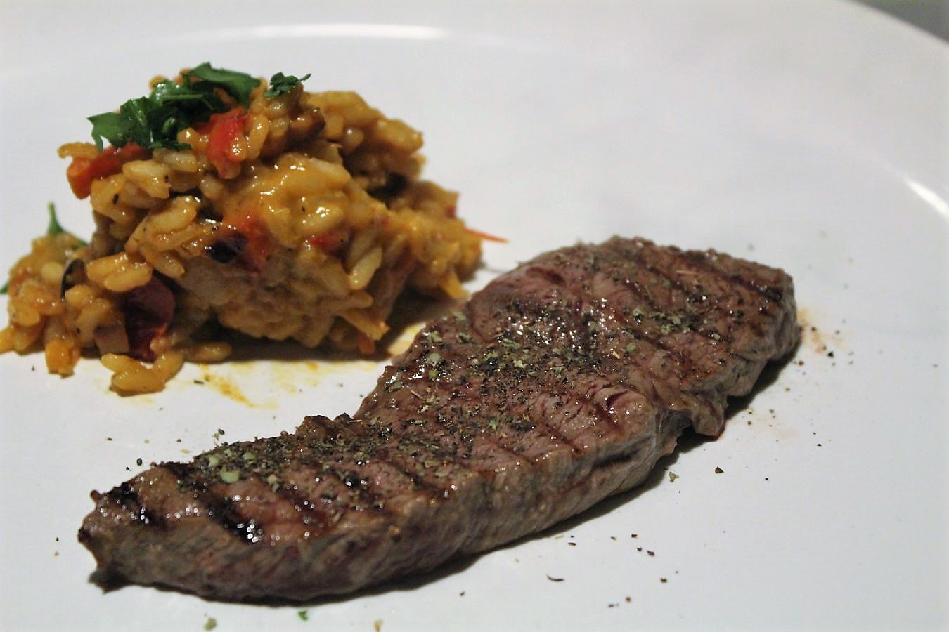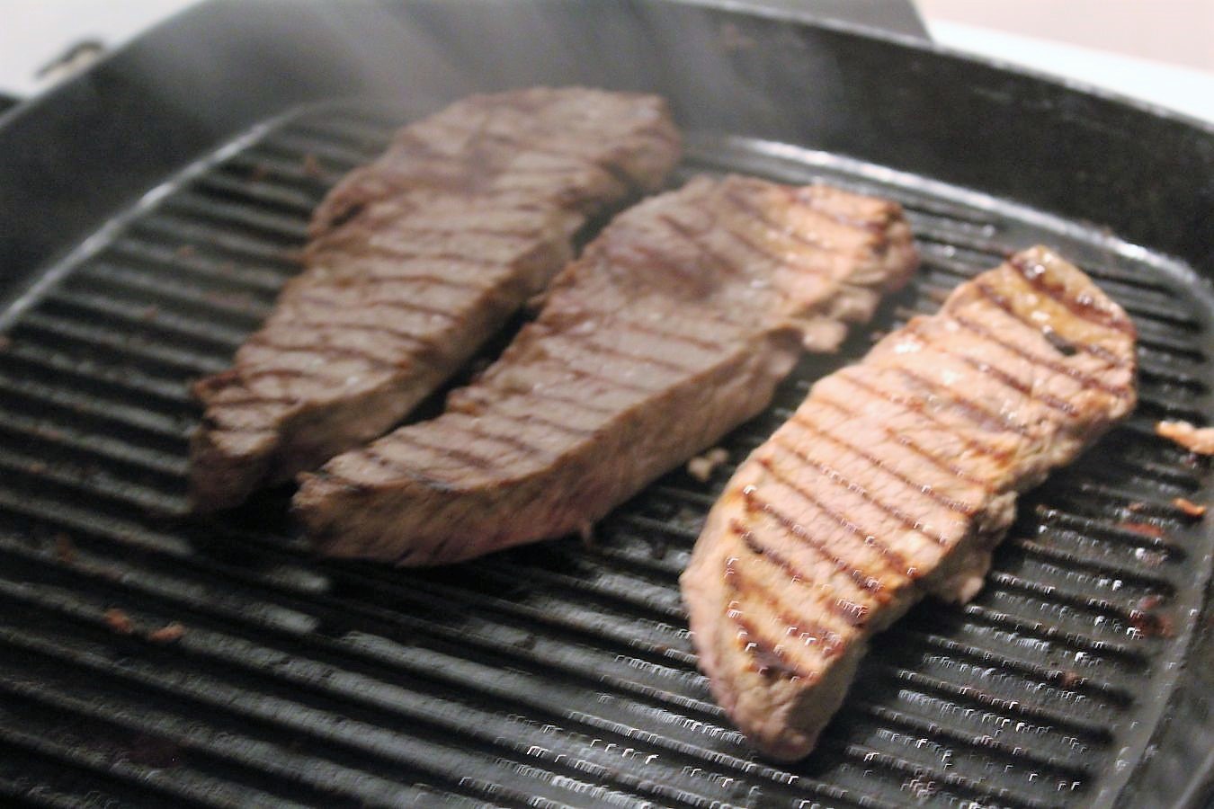 Während die Pute im Ofen ruht, kommt das Rind in die Grillpfanne. Je nach Dicke der Fleischstücke und dem gewünschten Gargrad, nehme ich auch da zwei bis drei Minuten pro Seite. Wenn man das Fleisch eher medium mag, kann es direkt auf den Teller.