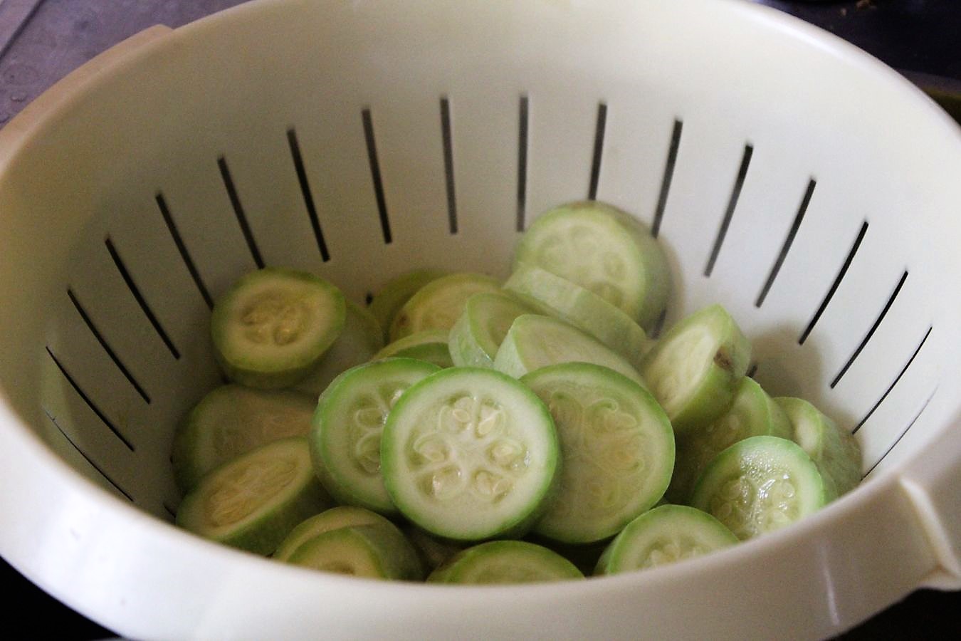 Zucchini in Scheiben schneiden, ein paar Millimeter dick, dünner als ein kleiner Finger. 1 Liter Wasser mit zwei Esslöffeln Salz im Topf aufkochen und die Zucchinischeiben darin für 2 Minuten blanchieren.