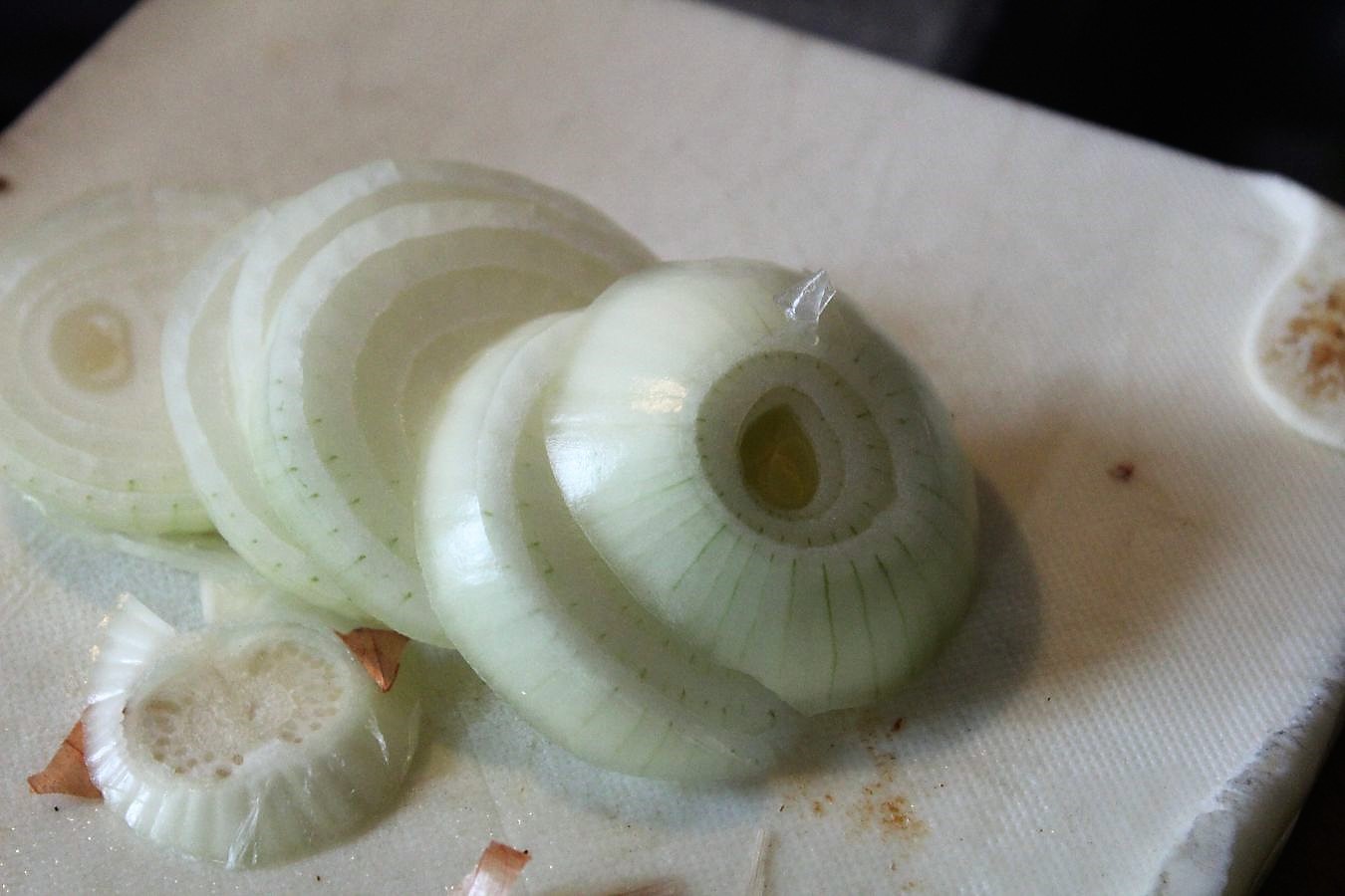 Zwiebeln in Ringe schneiden, oder nach Geschmack zerkleinern.