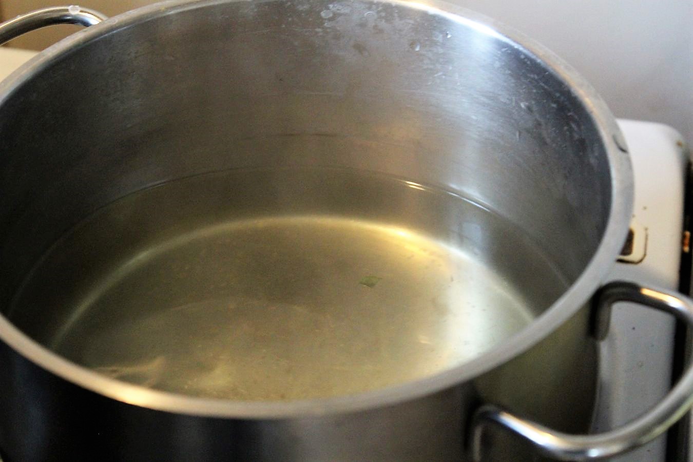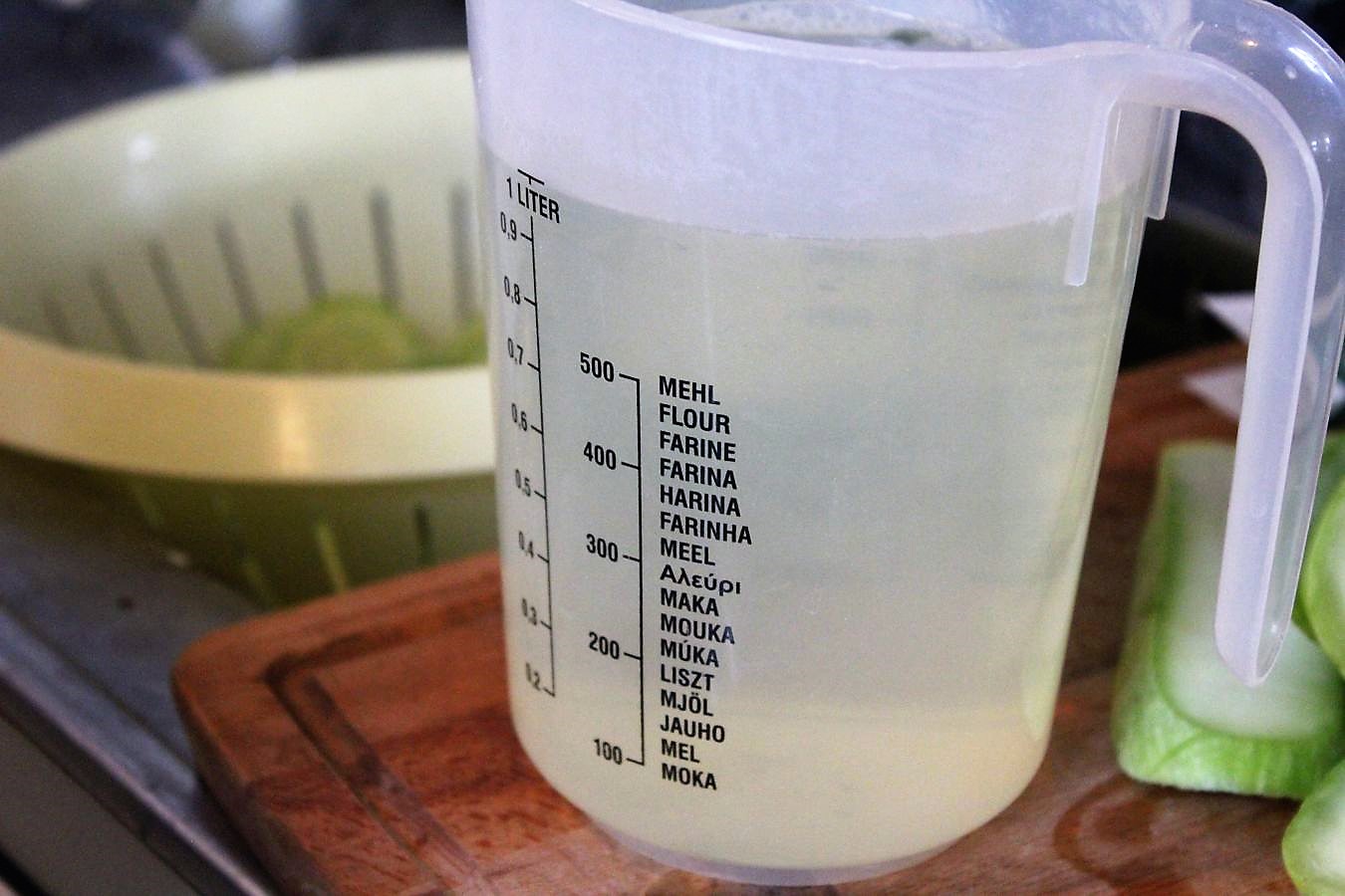 Den Liter Kochwasser gebe ich wieder in den Topf, in dem die Zucchinischeiben blanchiert wurden