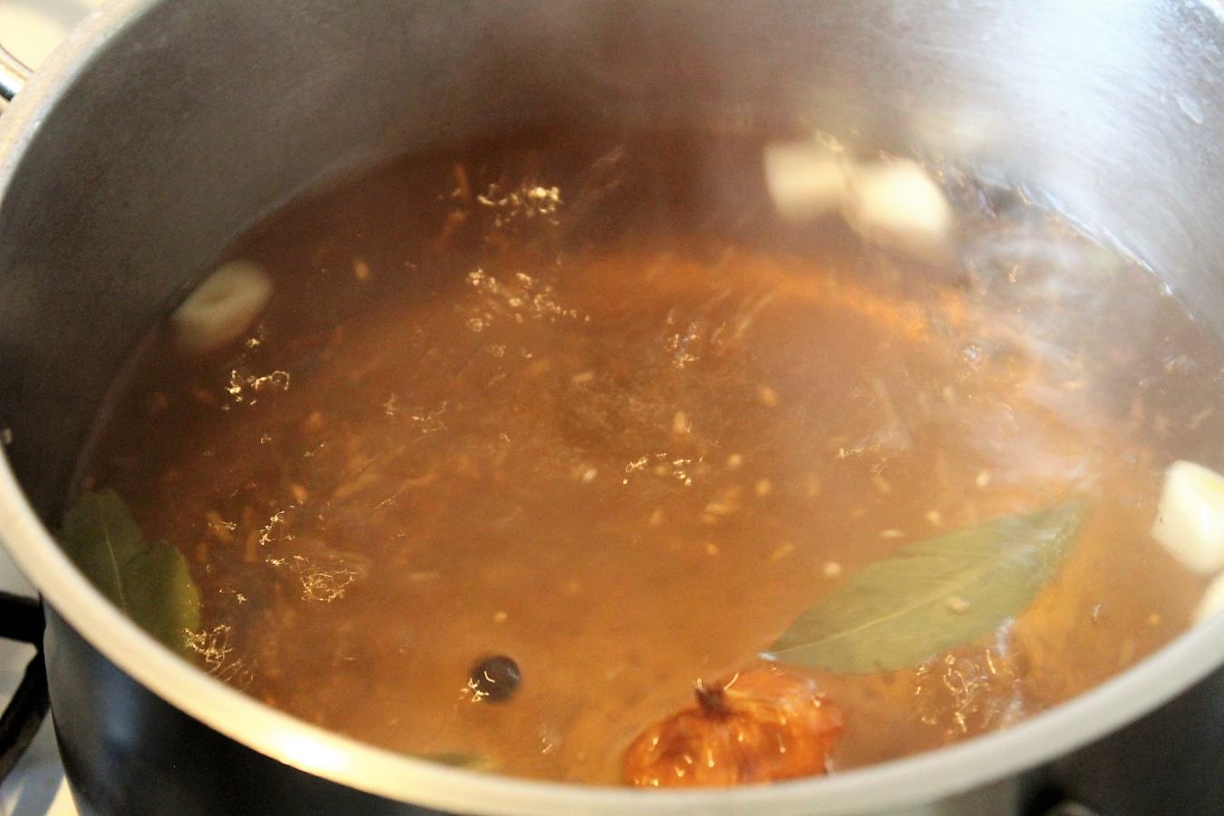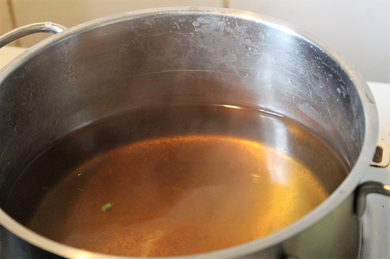 Beides zusammen soll wieder aufkochen und während der Sud aufkocht, kommen noch die anderen Zutaten hinzu