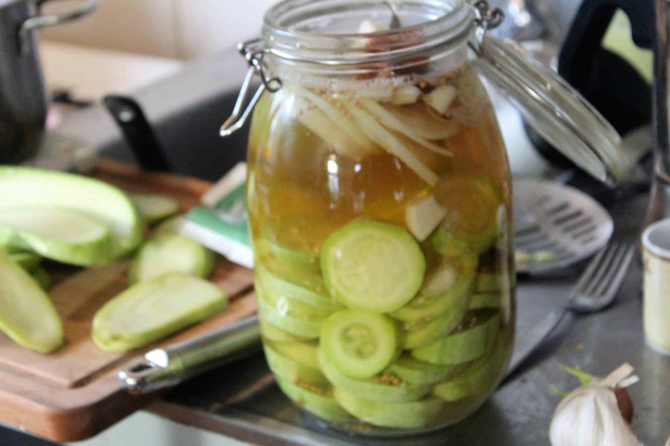 Hier meine eingelegten Gurken, äh Zucchini. Sehr lecker, sehr süßsauer, nicht zu weich, sondern noch mit ein bisschen Biss. Damit habe ich meine Gören mal so richtig reingelegt, die ja immer keine Zucchini mögen, die diese “Gurken” fanden sie mal so richtig lecker und die solle ich jetzt immer so machen