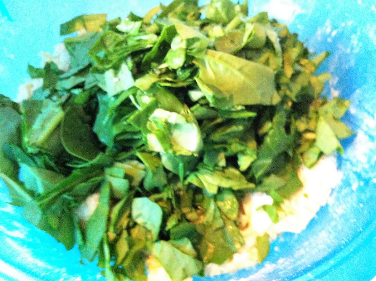 Den gehackten Spinat unter den Kartoffelteig kneten