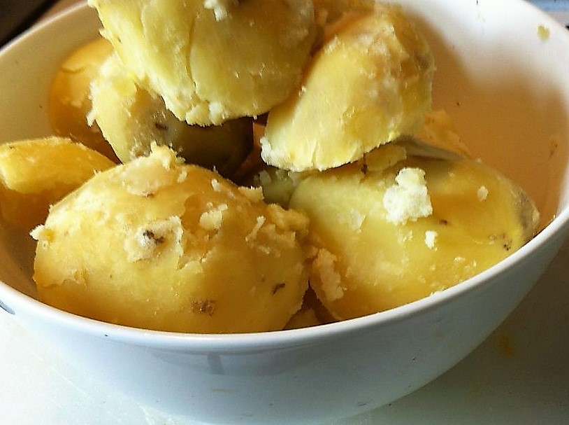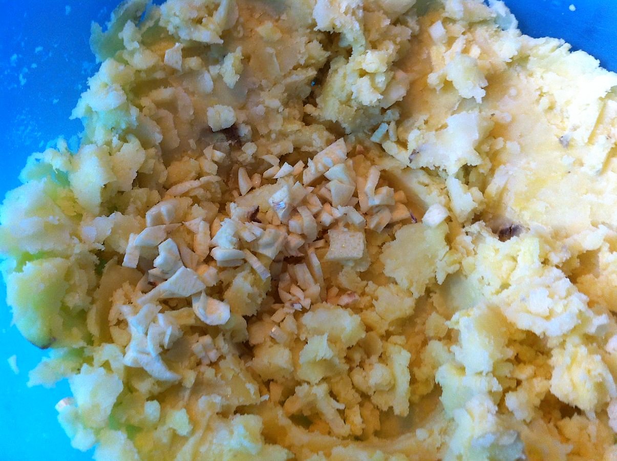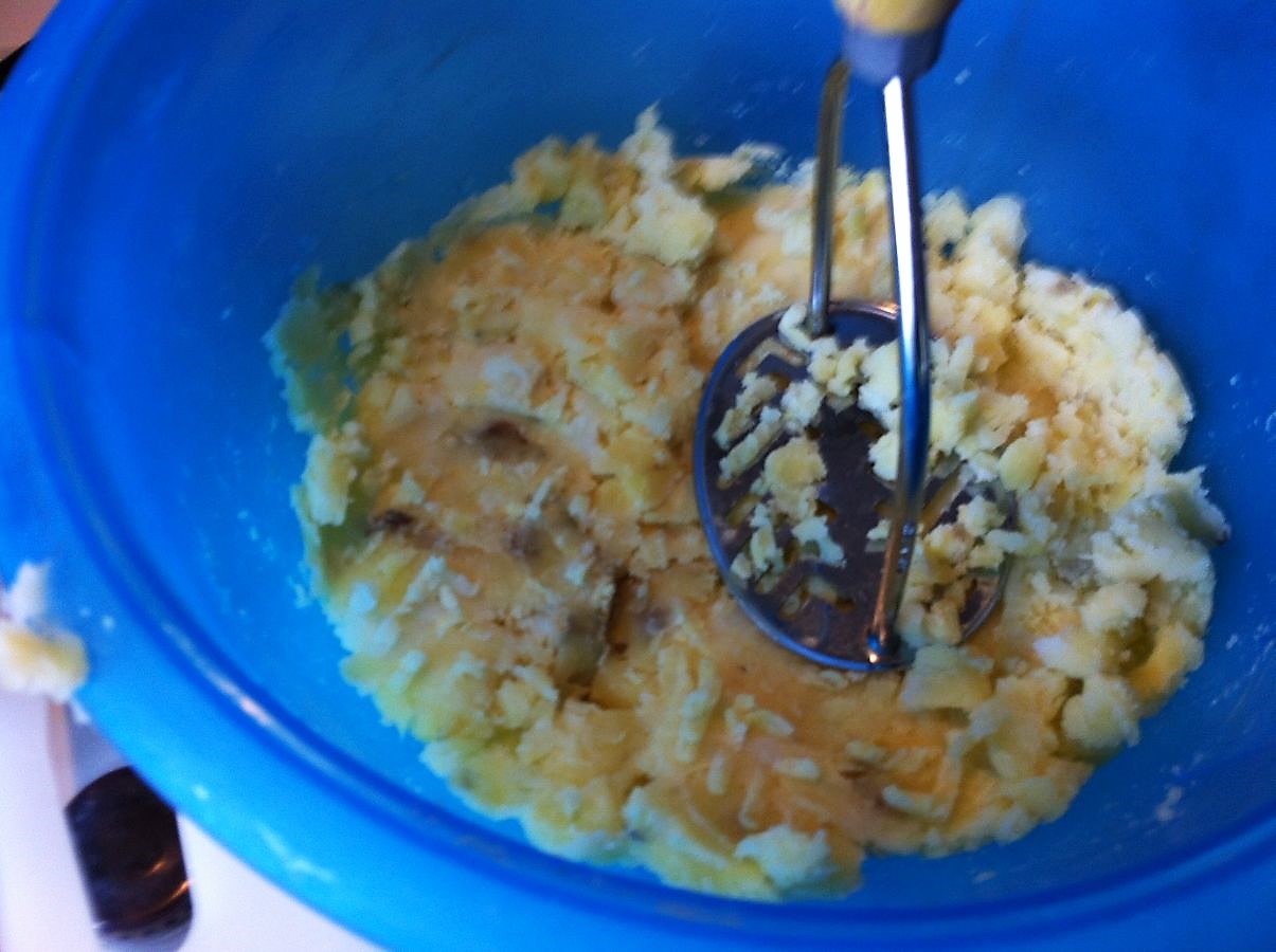 Kartoffeln stampfen, oder mit der Kartoffelpresse bearbeiten. Ich habe meinen Stampfer benutzt