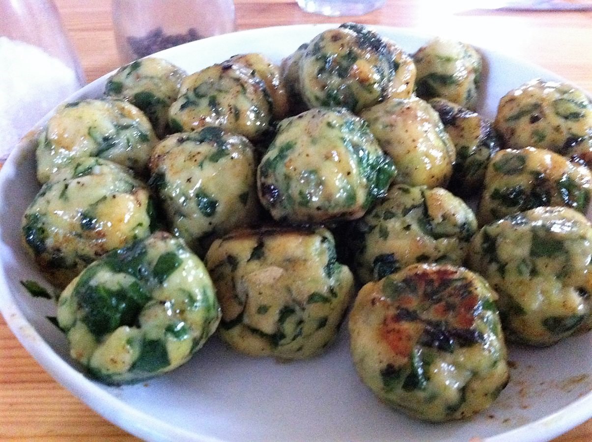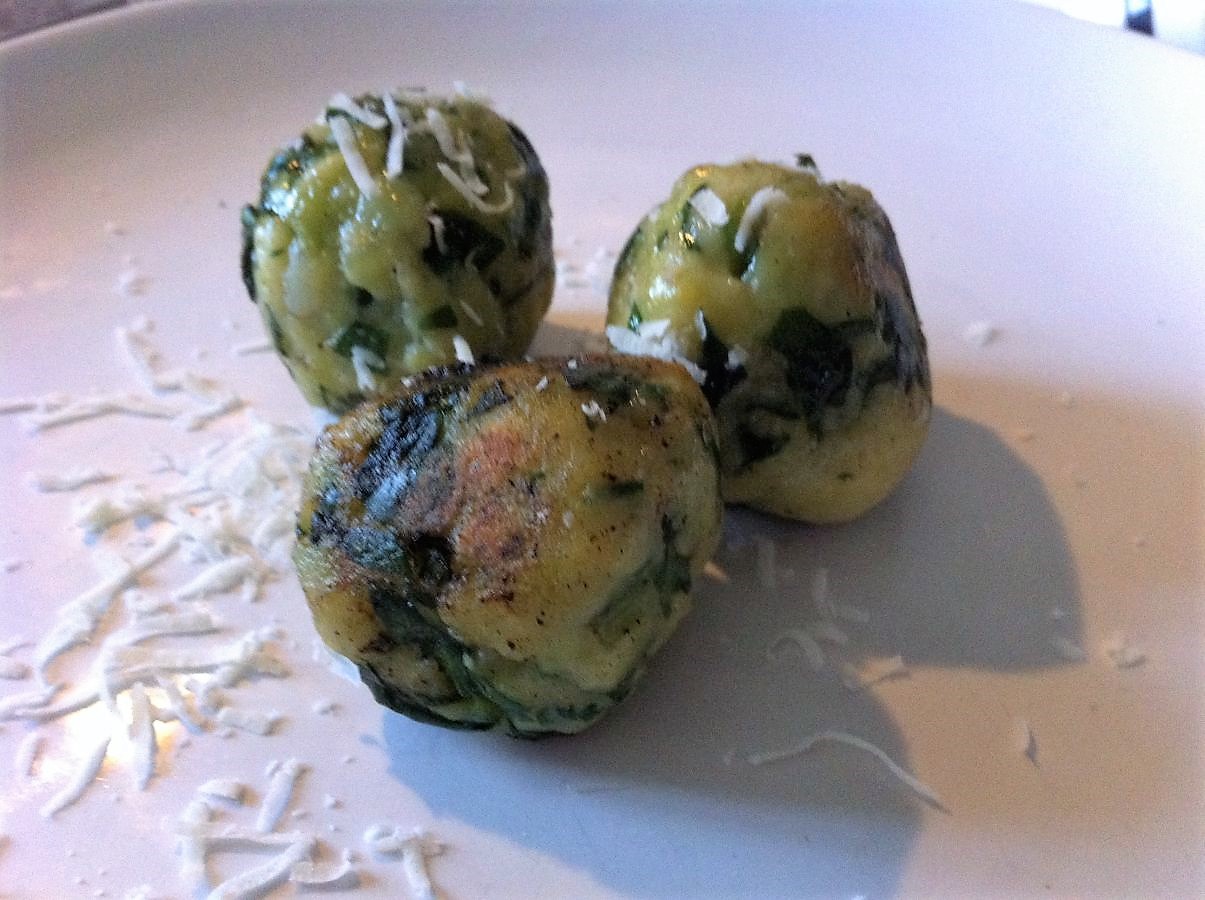 Alleine von den Spinatklößen kann man sich jedenfalls satt essen. Die haben eine tolle Konsistenz und sind deutlich spannender als Salzkartoffeln. Mit dem Knoblauch und dem Spinat adeln sie schnöde Kartoffelklöße ebenfalls.