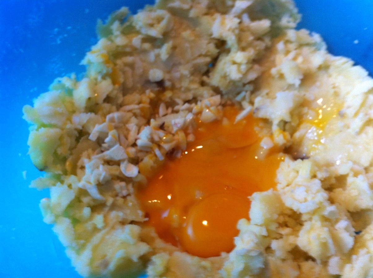 Drei Eigelb in die Schüssel zur Kartoffelmasse geben