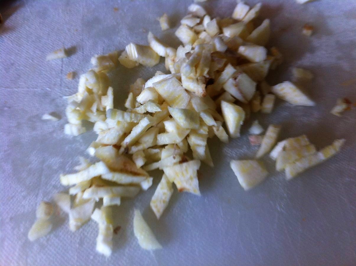 Die langen Stiele hinten abziehen und dann die Spinat in kleine Stücke hacken.