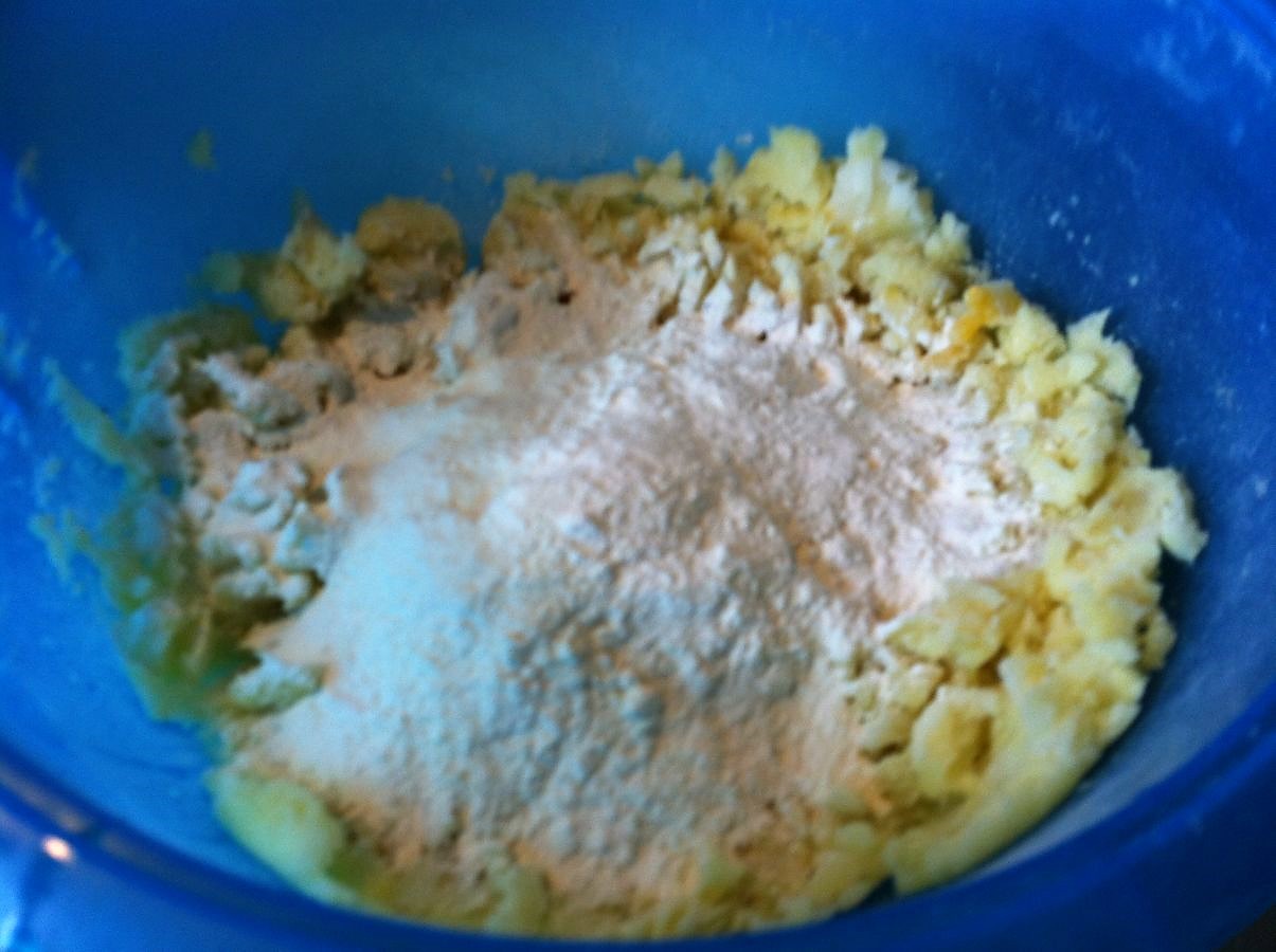 Ich fange mit 200 Gramm Mehl an. Das können 1 Kilo Kartoffeln und drei Eigelb immer irgendwie ab. Da Kartoffeln ein Naturprodukt sind, weiß  man auch beim Kneten erst, wie feucht die sind und ob man vielleicht noch 100 Gramm Mehl extra verwenden muss.