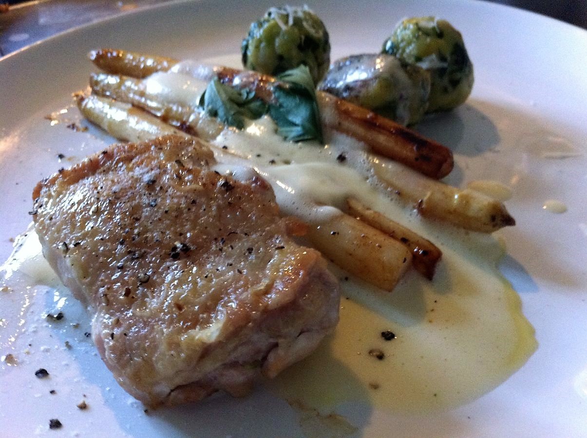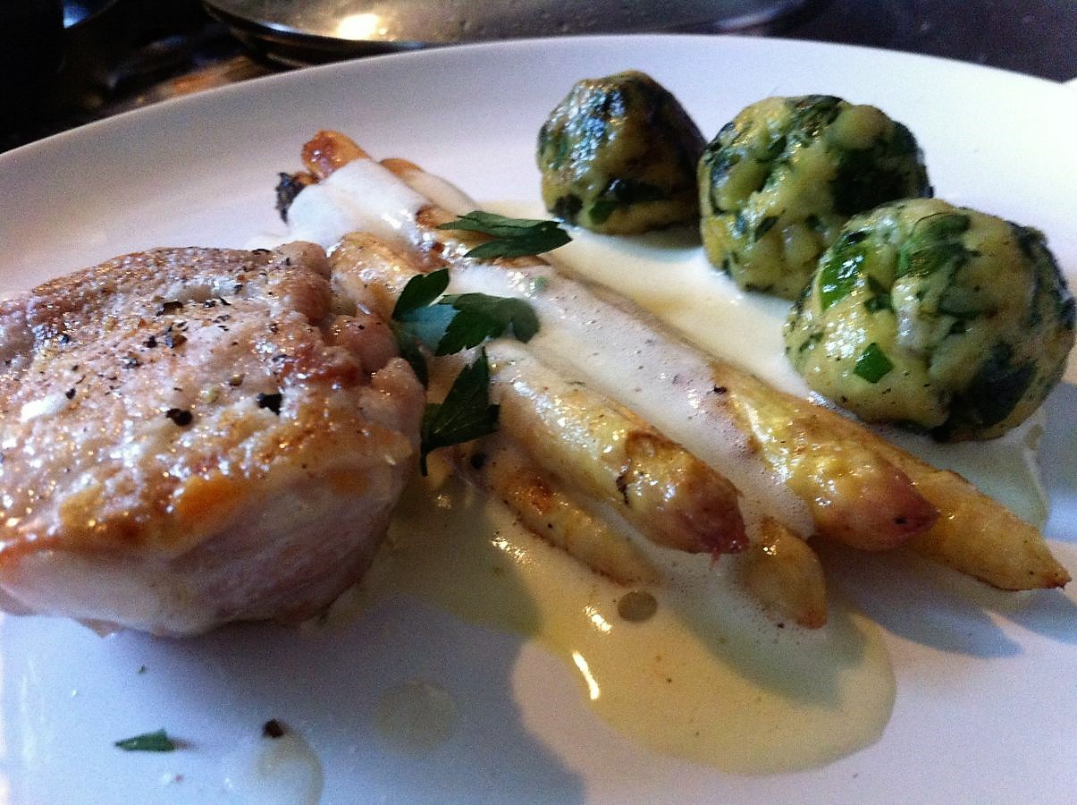 Hähnchenoberkeule mit Spargel, Spinatklößen und Béarnaise