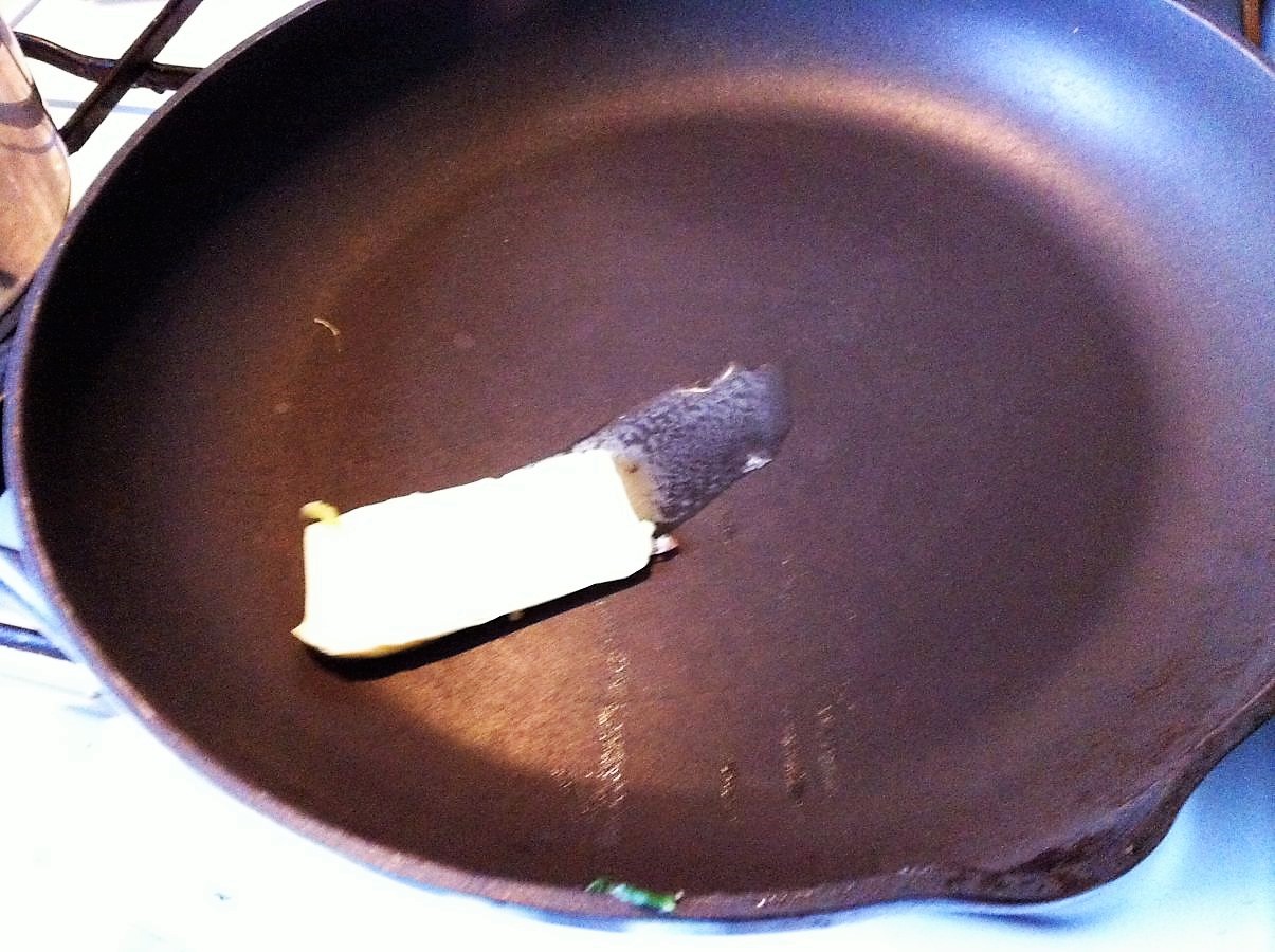 Dann die Sauce béarnaise vorbereiten, zumindest schon mal die Butter schmelzen. Der kann man noch mal einen Wärmeschubser geben, bevor man sie mit dem Eigelb aufschlägt.