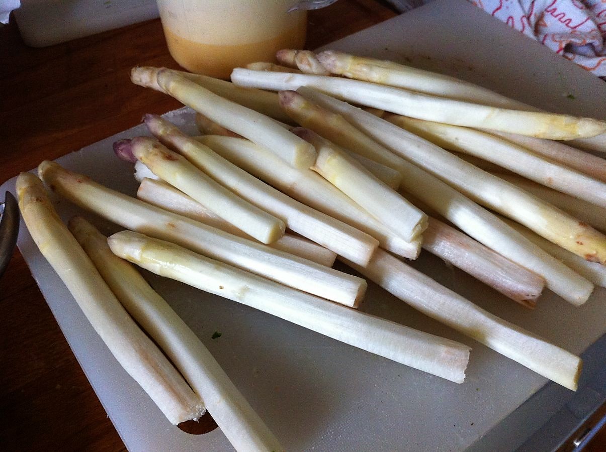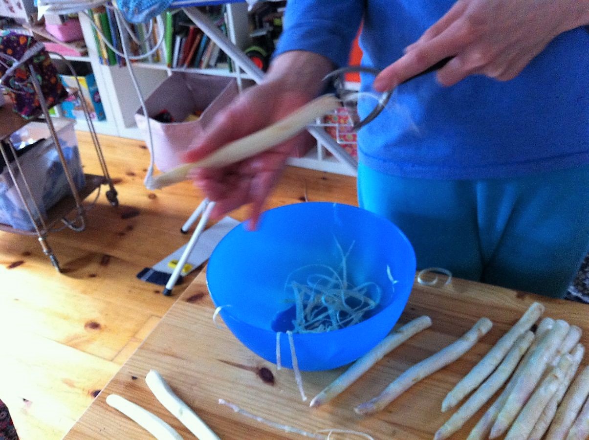 Spargelschälen. Das ist eine Archivaufnahme vom Vortag, als Frau Glatzkoch zur Feier des Tages ausnahmsweise Spargel geschält hat. Am Muttertag musste sie das natürlich nicht tun. Nach einem Kilo war sie schon am Murren. Da habe ich nur gesagt, “ich habe Dir in den letzten 9 Jahren schon einen ganzen LKW Spargel geschält, was ist Dein Problem?” Das weiß ich bis jetzt noch nicht, war also wohl doch nicht so schlimm.