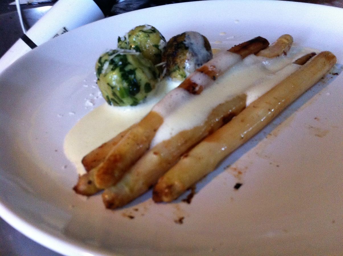 Nun geht es ans anrichten. Spargel und Spinatklöße auf dem Teller drapieren
