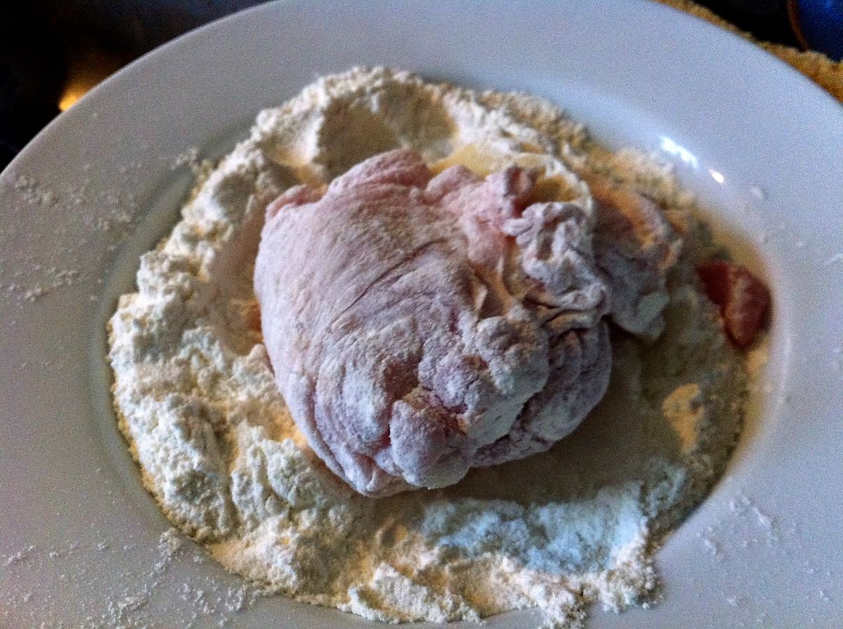 Fleisch von beiden Seiten ins Mehl drücken und darauf achten, dass das Fleisch überall gut bemehlt ist.