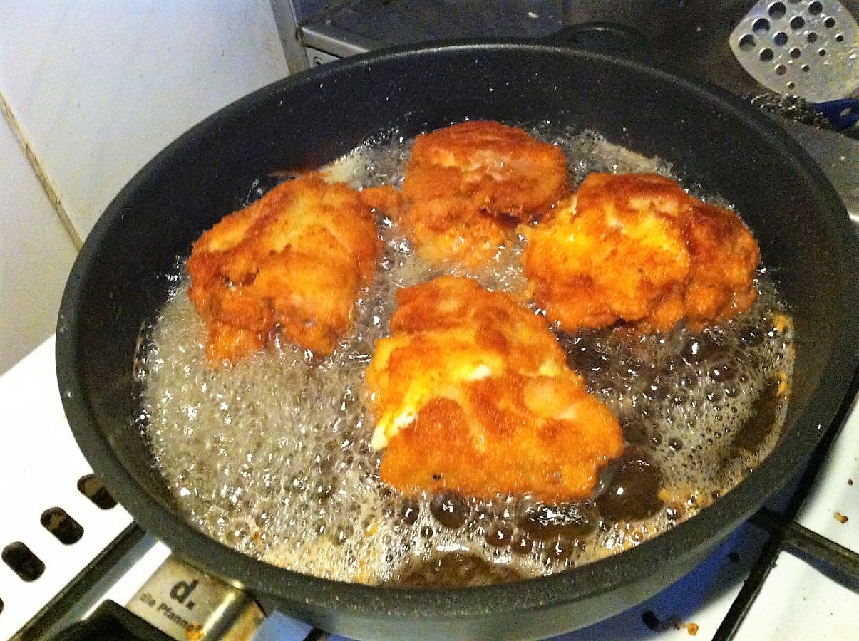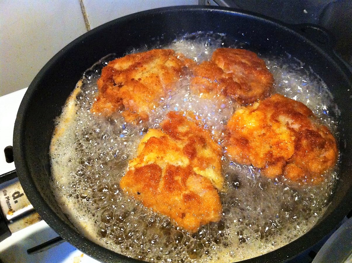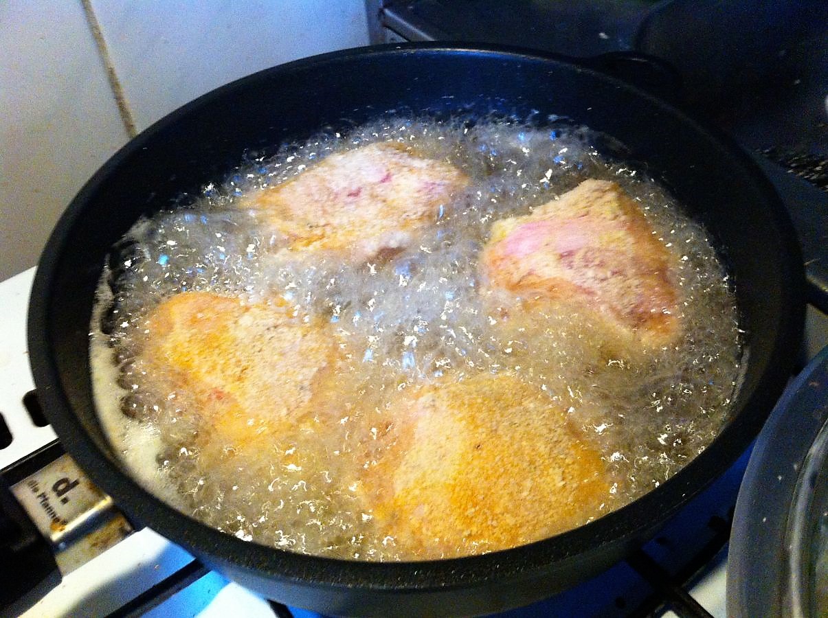 Pflanzenöl in der Pfanne erhitzen. Nicht sparen, das Fleisch soll im Fett schwimmen und bis zur Hälfte bedeckt sein. Dann ist gesichert, dass das Fleisch gleichmäßig gegart wird und man muss es nur einmal wenden und deswegen geht das Fleisch auch nicht wieder auf, weil man nicht ständig daran fummelt. Herd auf der größten PLatte, volle Pulle laufen lassen, bis das Fett heiß ist, wenn das Fleisch hinein kommt, auf 3/3 runtergehen, wenn Ihr nach drei Minuten beim Wenden merkt, dass das Fleisch zu schnell dunkel wird, auf 1/2 Kraft zurück drehen.