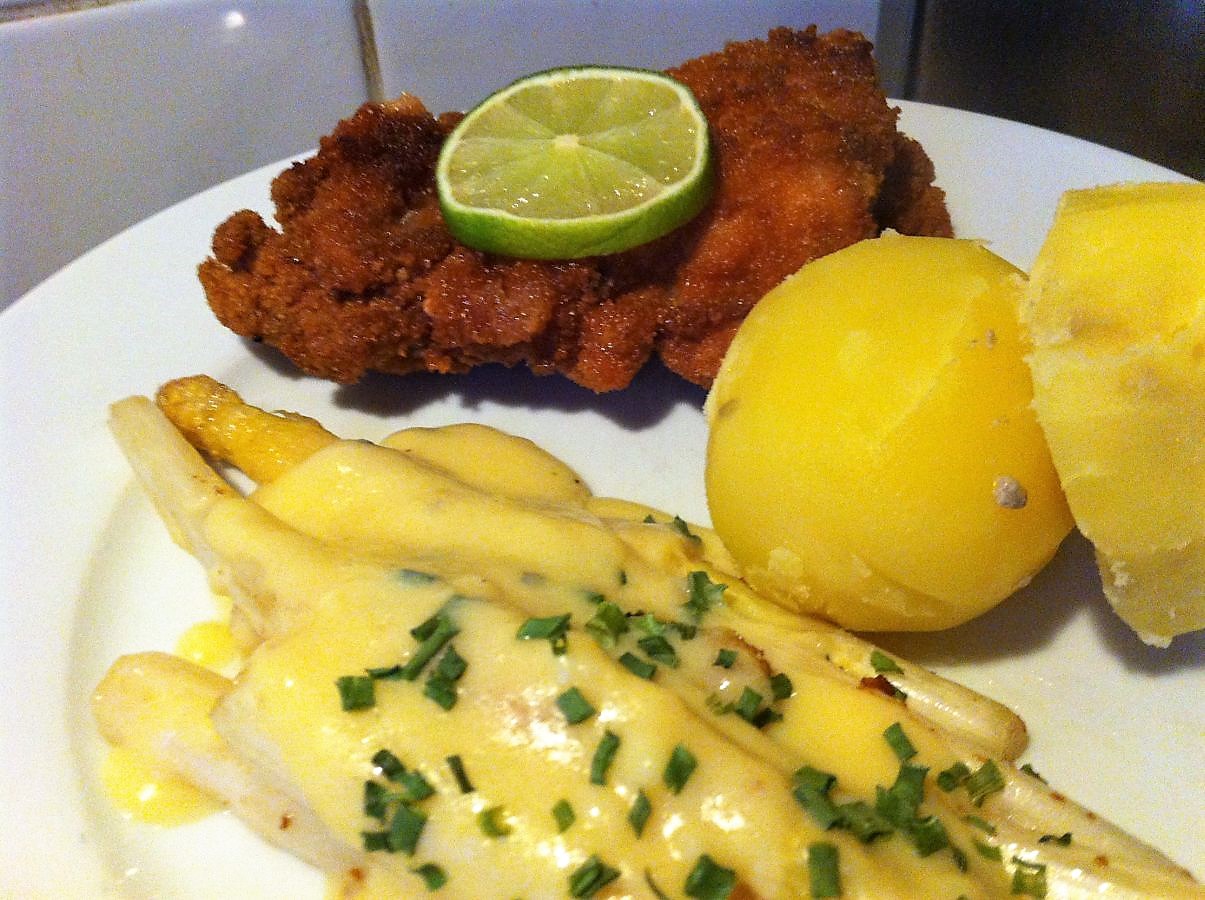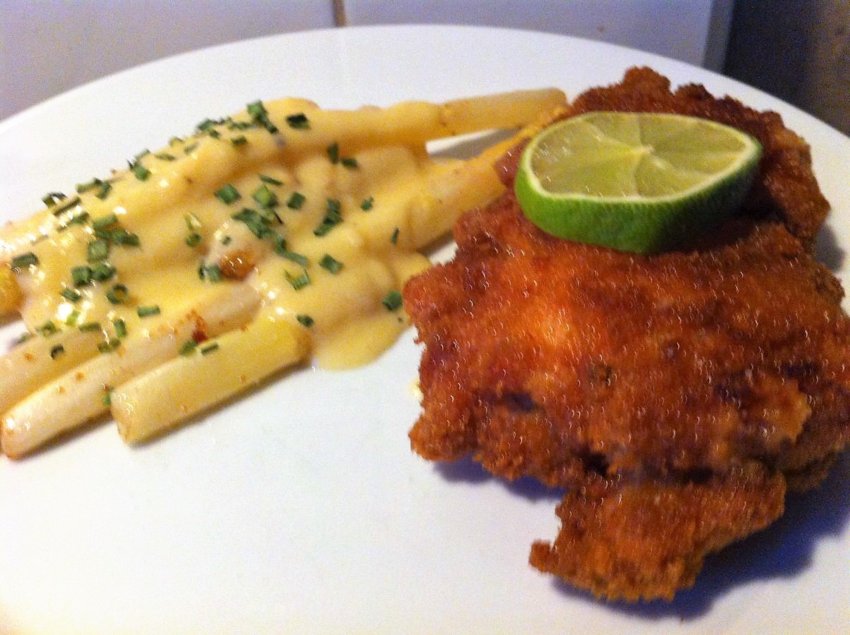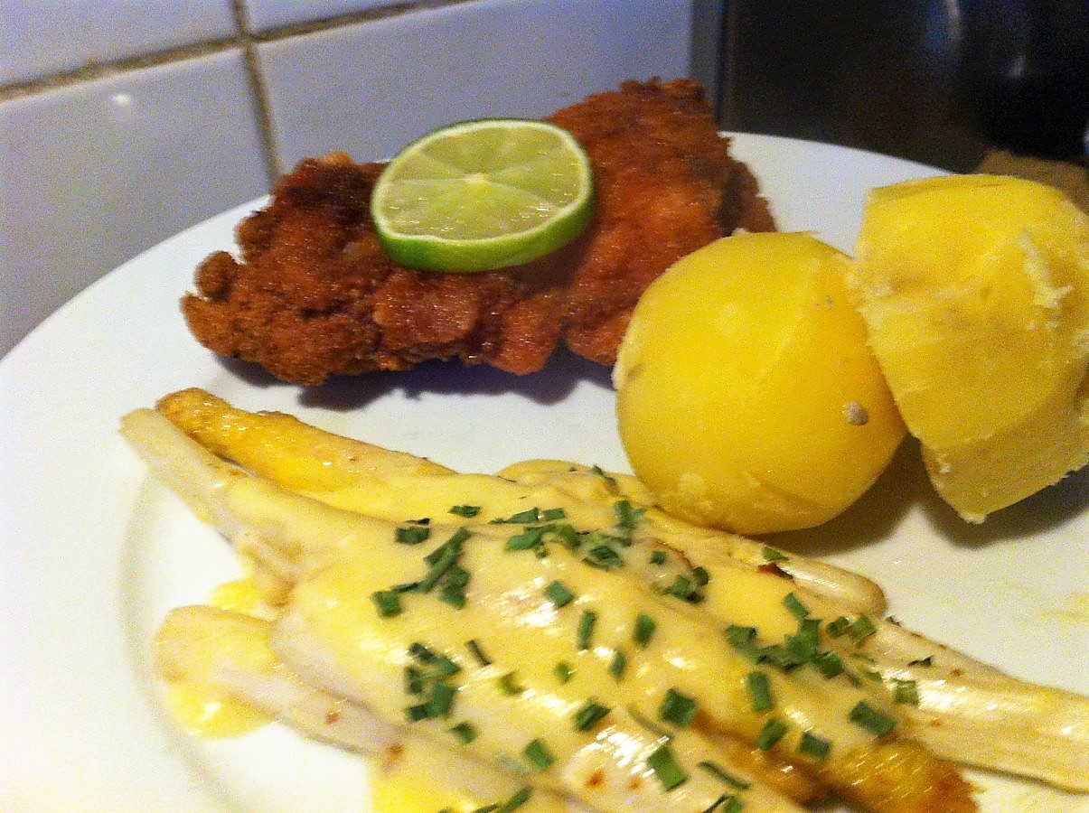 Den Spargel kann man kochen, ich habe den einfach in das Bratfett der Schnitzel geworfen. Das war eh gerade da und heiß war es auch schon.