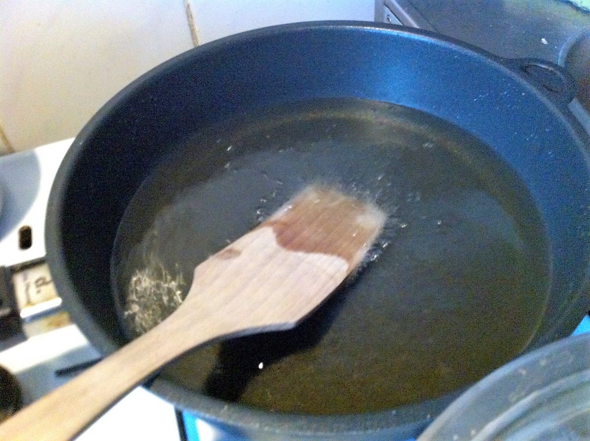 Ein Pfannenwender ist das Thermometer. Wenn daran die Blasen sprudelnd aufsteigen, ist die Temperatur gut