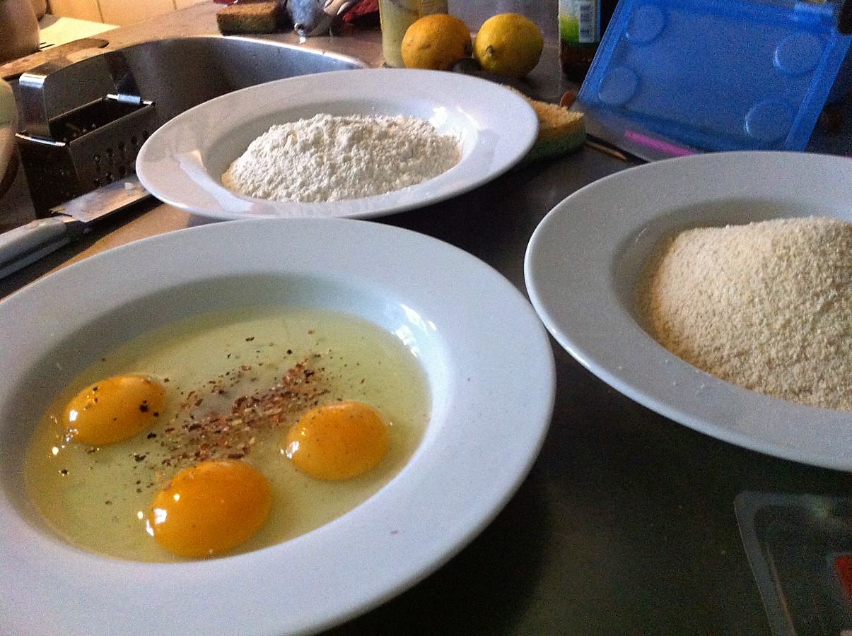 Das bemehlte Fleisch durch das verquirlte Ei ziehen