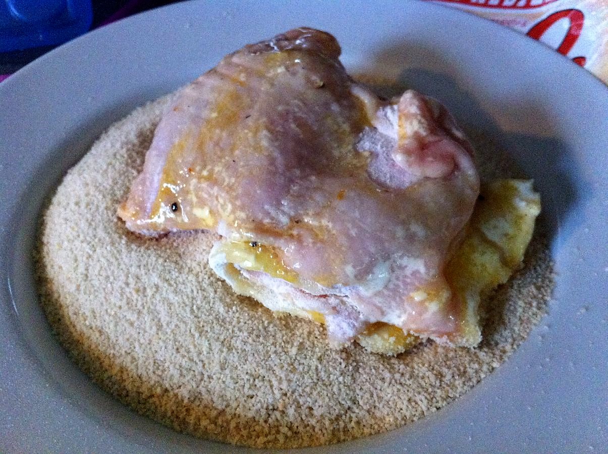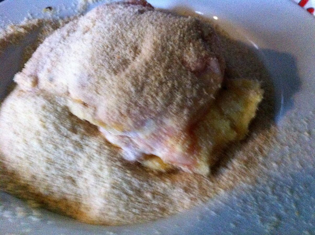 Danach das Paniermehl von beiden Seiten ordentlich ins Paniermehl drücken und auch an den Seiten vernünftig andrücken, damit alles dicht wird.