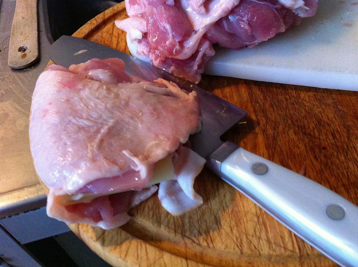 Lieblingslehrer mal mit acht Atü Rotwein auf dem Kessel eine halbe Nacht lang Wortmeldungen und Rezepte auf dem Bildschirm mit rotem Filzstift korrigiert hat, weiß ich dass man dieses Machwerk nur á la cordon bleu nennen darf, weil es nicht mit Kalbsfleisch gemacht wird. Cordon bleu ist ja leider so verhunzt, dass es nur eine Frage der Zeit ist, dass es das auch noch mit panierten Spülschwämmen gibt. Meine direkte Vorstufe dazu, ist die Verwendung von entbeinten Oberkeulen vom Huhn.