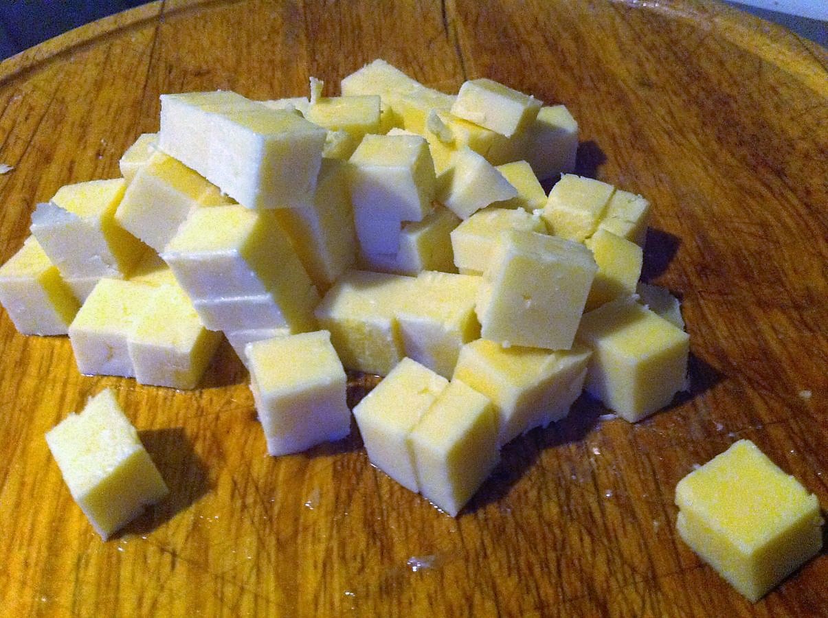 Die Hälfte davon (200 Gramm) in kleine Würfel schneiden.