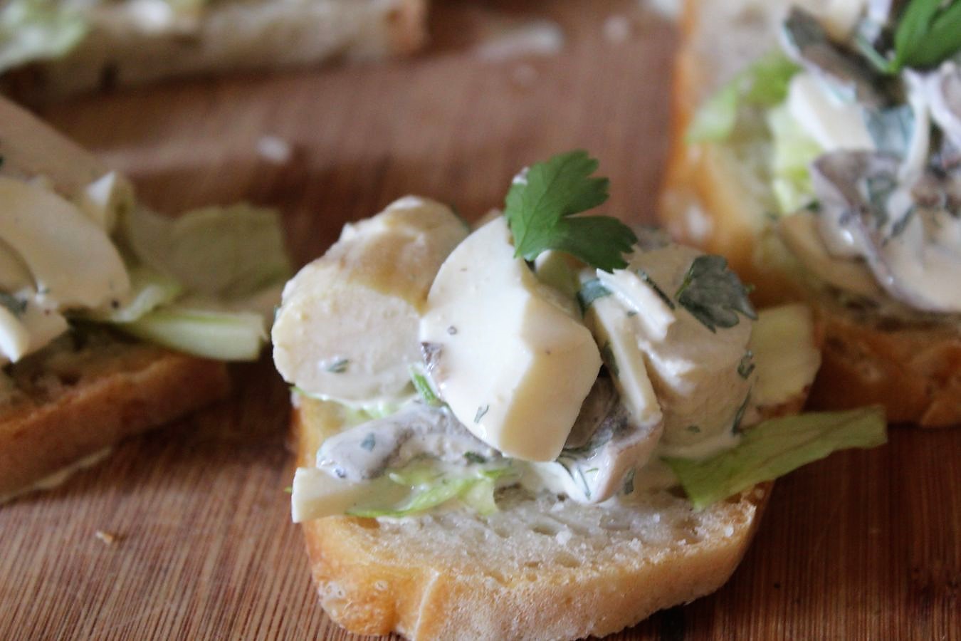 Der Eiersalat schmeckt durch die fette saure Sahne sehr voll und rund. Spargel, Champignons und Eier zusammen geben auch ein tolles Geschmacksbild.